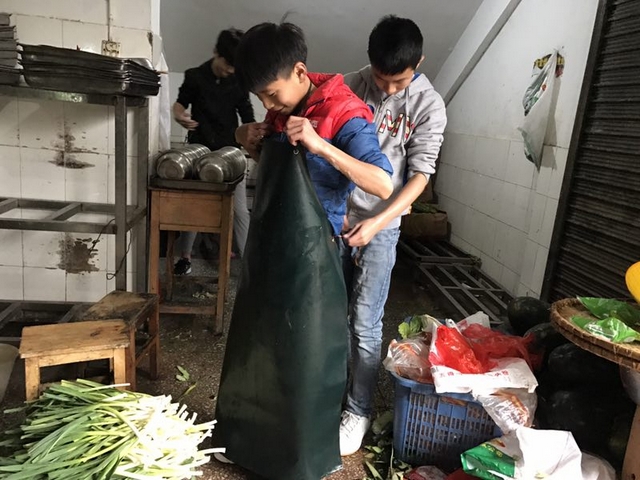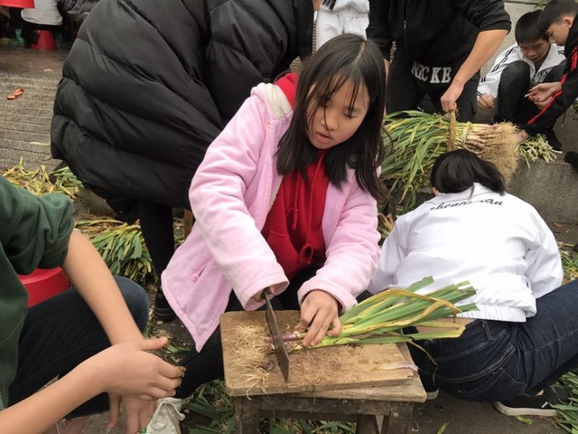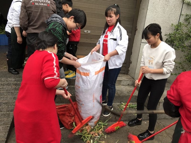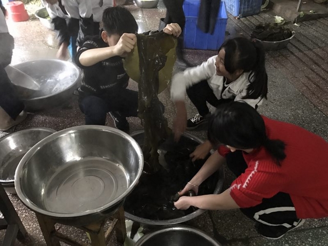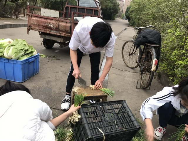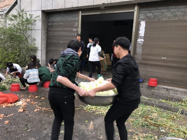 同学们一到食堂,有的立马撸起袖子,卷起裤腿,蹲坐在地上,眼睛盯着食堂阿姨一动不动,学习她是如何快速择菜,然后立马付诸实践。有的男同学主动挑大梁,向食堂阿姨借来了菜刀,“咚咚咚”把这些青菜三下五除二就给择干净了。为了提高备餐效率,同学们积极主动、分工合作、互相配合。这边的菜刚择干净,那边就立马开始了洗菜。洗菜的同学也是丝毫不敢掉以轻心,小心翼翼将择好的菜放在水盆里面,仔细清洗。