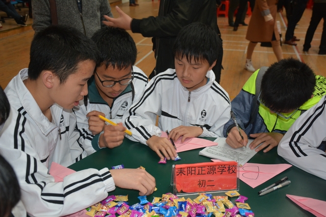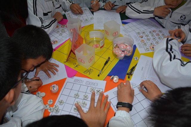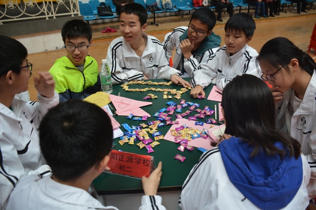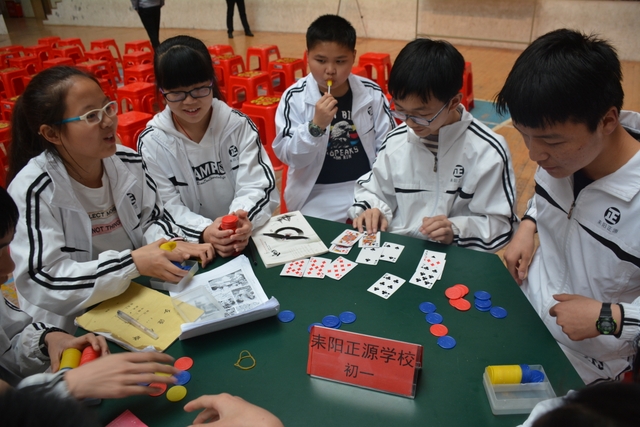 准初一组展示了“狼与羊”游戏,游戏时,每位同学都不断的摆放自制的“狼”和“羊”的道具,时而互相讨论,时而变更方案,时而记录总结。引起与会老师的围观、讨论和赞许。初一和初二是一个组,展示的是“彩色三角挑战”,游戏中,10位同伴分工合作,有组织的,有记录的,有操作的,也有中心发言人,大家在摆弄三色圆片的同时,还争先恐后的发表自己的见解,最后形统一共识。让与会老师留下深刻的印象。准高一组的游戏是“WhoTooktheCandy?”,用糖果作道县,游戏问题的拓展既深奥又不失浓浓的趣味性,也引来众多老师的好奇,纷纷驻足观看。
