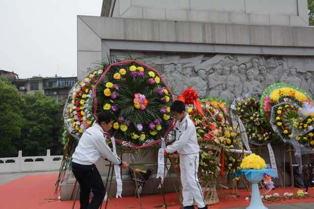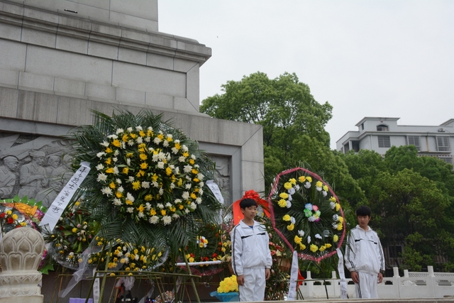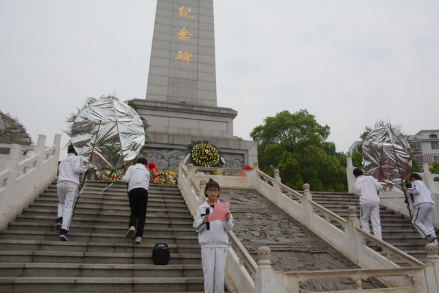 随后同学们排着整齐的队伍,向纪念碑敬献了鲜花,大家神情肃穆地低下头,静静地肃立着,表示对革命先烈的无限景仰与哀思。
