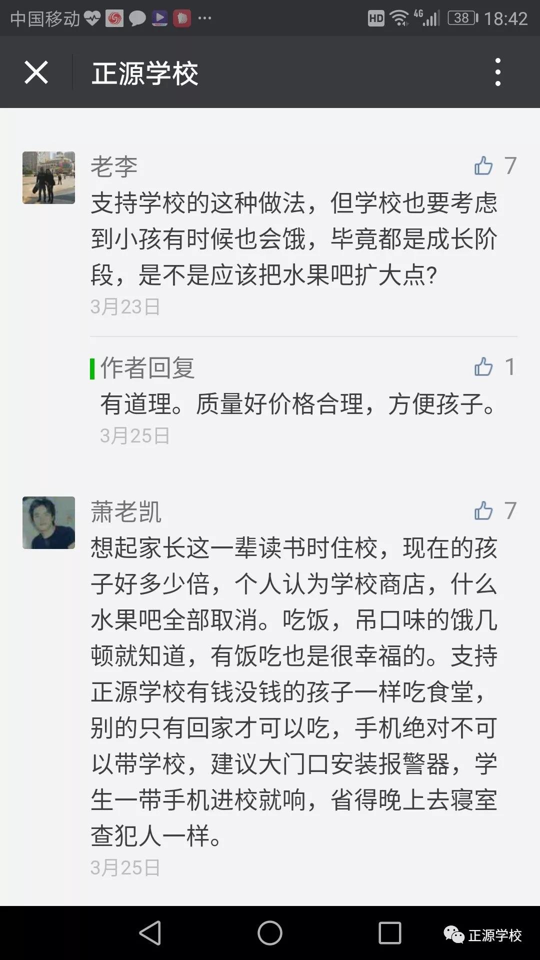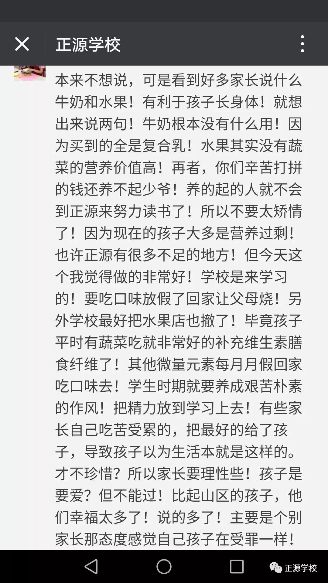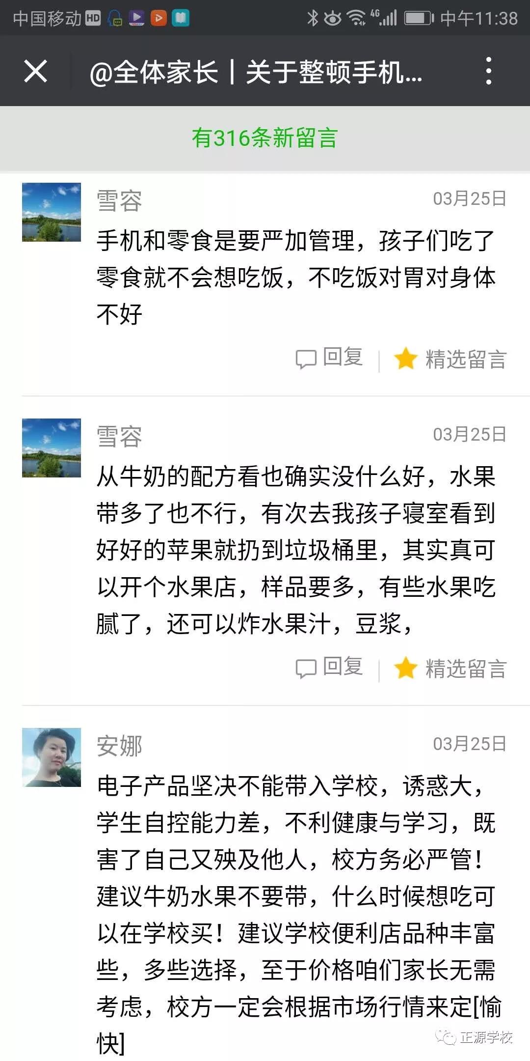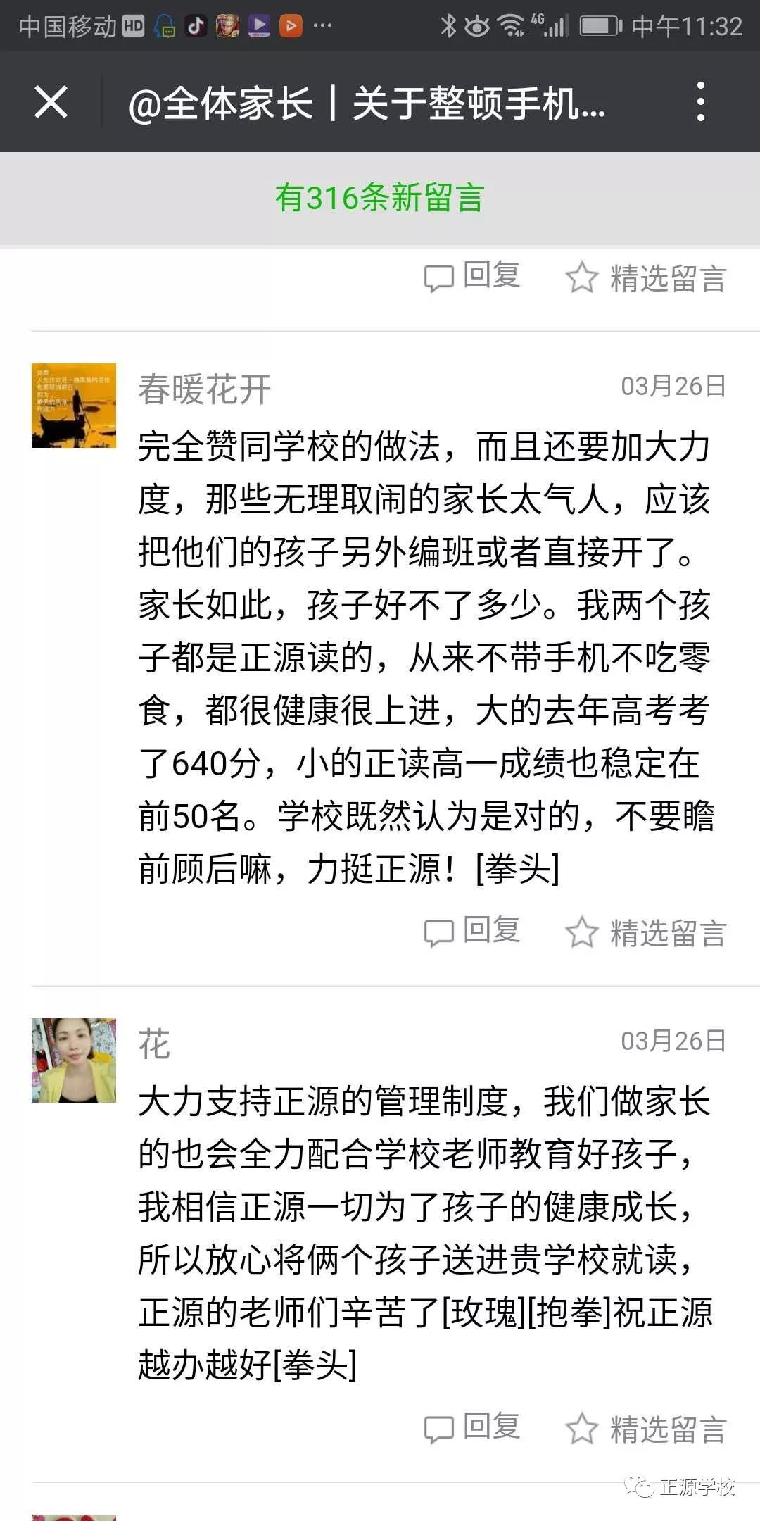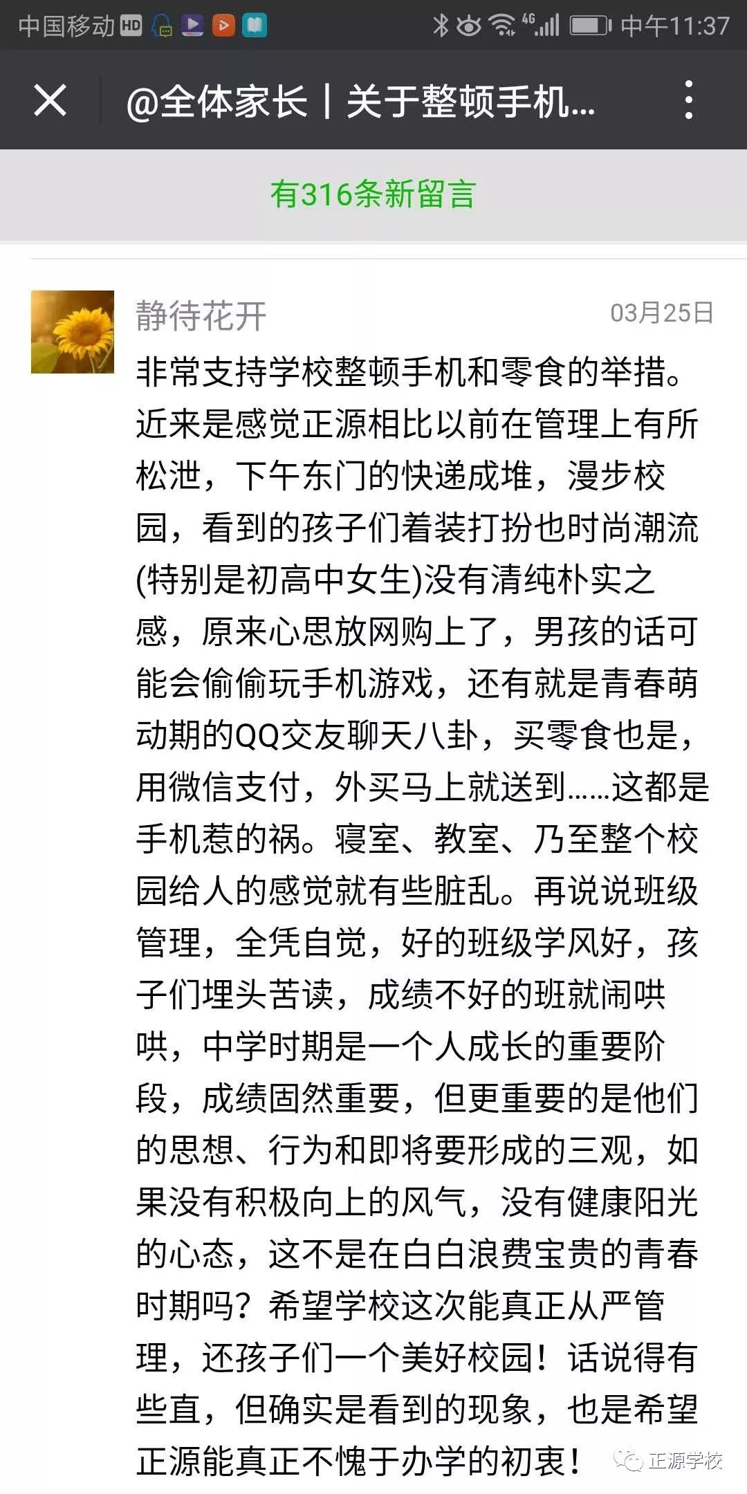 但是,在学校微信公众号的留言,第一天还反响很好,部分家长在表达不同意见的时候,主要是希望允许带牛奶和水果、面包。但是到了第二天也就是星期天下午,正是高中部学生放周假的时候,突然反对意见大量增加,有些学生开始恶语中伤。更有甚者,个别学生冒充家长,发表的言辞激烈的留言,被点赞顶到了最前面。留言中对手机被收缴,口口声声要报警。是的,三天内从寝室收缴了50部手机,估计没有被收缴的还会有500部吧,这些同学怎么可能忍受失去手机的孤独?当今社会,几乎无论男女老少,一有机会就会死死盯着手机,不仅边走路边看手机,还有边骑摩托边开汽车边看手机的,何况是学生呢。问题已经严重到这种地步,正源学校必须用最严厉的手段,坚决制止学生带手机进校园。同时,也请各位家长严格监督孩子,绝对不可以让孩子们玩手机上瘾。为强化学校对学生的管理,今后,凡属星期天下午高中部放周假或者其它时间放月假或半月假,正源学生一律不得进网吧,一旦发现,学校将给予最严厉的处罚。