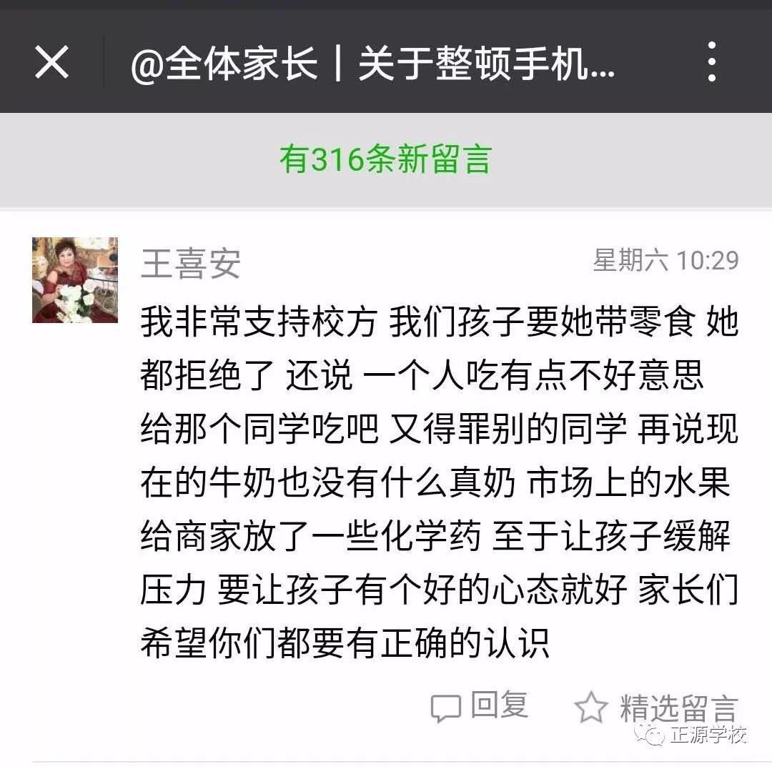 3月23日,正源学校微信公众号《关于整顿手机和零食等告家长书》得到了广大学生家长的热烈拥护,97%以上的家长对于禁止手机和零食表示赞成,而持反对意见的基本上都是认为带牛奶和水果还是可以的。比如小学部五年级194班廖同学的家长说,“ 越是严厉的学校,越能教出好的学生。”初二301班徐同学家长说“家有家风,校有校规,国有国法,入乡随俗,严师出高徒,理解支持!”李同学家长说“为了孩子的健康成长,严是爱,松是害。”