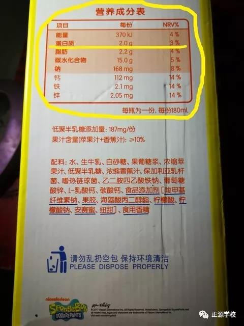 首先,我要问,你们给孩子带到学校来的是牛奶吗?我敢肯定90%不是!你不要看到包装上有一头牛或者写了牛奶两个字,或者写了“真的牛奶”,就以为你喝的是牛奶了。你们真的不要被广告所忽悠,然后害了孩子一辈子。我国现阶段牛奶的国家标准中,有一项重要指标蛋白质的含量是100毫升2.8克,这是全世界的最低标准!你们认真看看你买的“牛奶”,蛋白质含量是不是1克?我们通过去寝室随机抽样,发现你们买的所谓“牛奶”,绝大部分是含乳饮料,就是说饮料里面确实有牛奶成分。可能你会说:好吧,就算牛奶含量少,它总有一点营养吧,比喝白开水要好吧?但是,你可能想不到的是,为了这1克蛋白质,你得吃有对人体有害的甜味剂、芳香剂、增白剂、防腐剂等多种添加剂,真是得不偿失。这些假牛奶,孩子们吃的不是营养、健康,而是口感,是一时的享受,后果很严重啊!