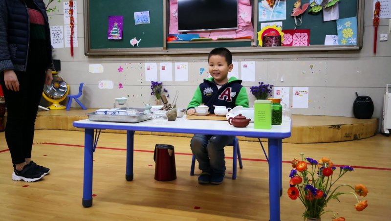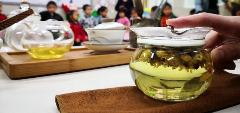 这次选择了两款茶,铁观音和菊花茶。去年秋天,孩子们亲手种下菊花,看着花儿的绽放与凋零。现在,他们又发现菊花居然也是一种茶,闻起来香香的。孩子们在整个茶艺学习的过程中,都很认真,也很兴奋。后来听一位家长说,她家轩轩回去以后偷偷用掉了她的小半罐菊花,给家里每个人泡了菊花茶。轩轩在给家长们奉茶的时候用的是“举案齐眉“的姿势,认真的态度让爷爷奶奶感动。