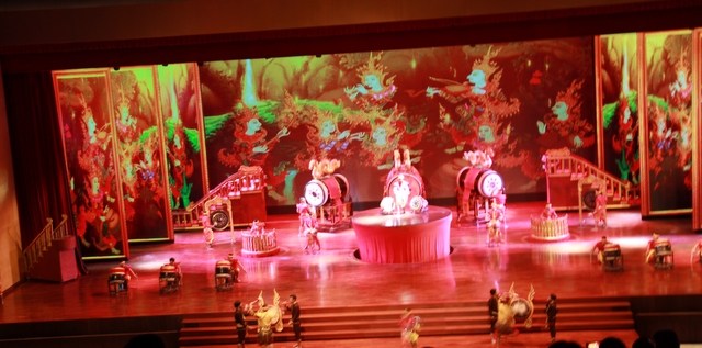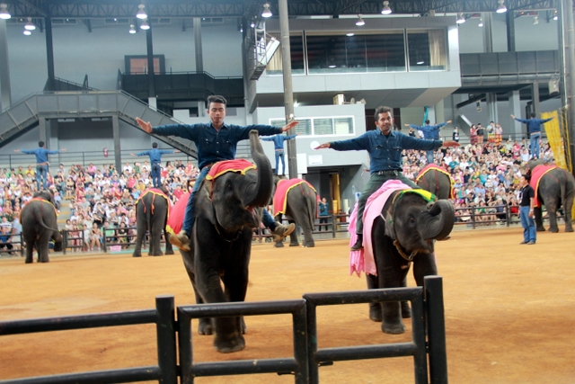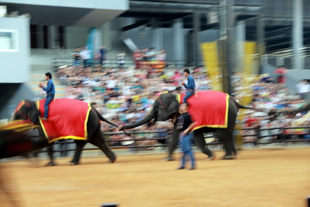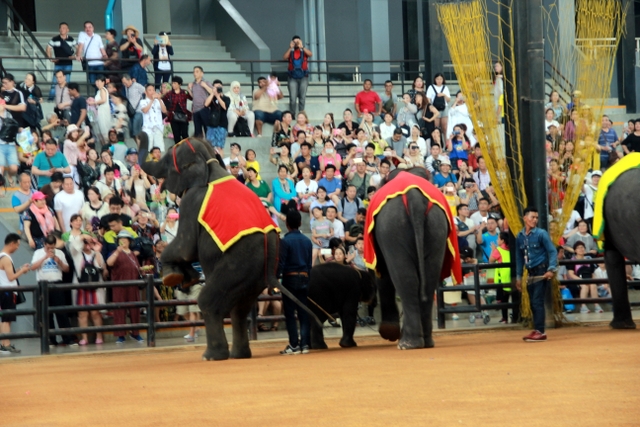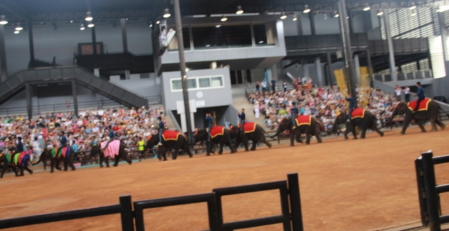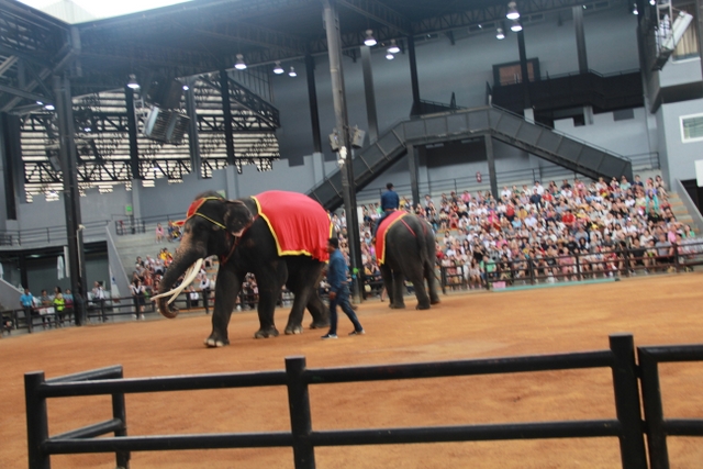 随之看大象表演。二三十头大象从小到大,前后勾连,绕场一周,分别向观众行礼,有的点头,有的抬脚,有的鞠躬,憨态可掬。接下来表演投掷飞镖,十几米远的距离,两头大象比赛,各投三支,有一头大象居然投中一支,飞镖到处,气球砰响。大象画画,画出的树木花草像模像样,主持人介绍,一头成年大象相当于八岁儿童,此言不虚。