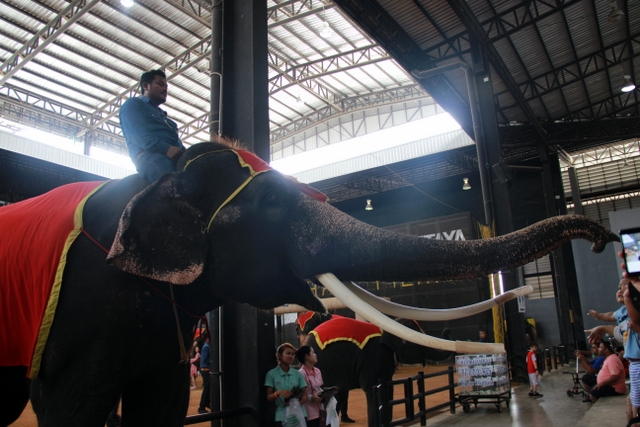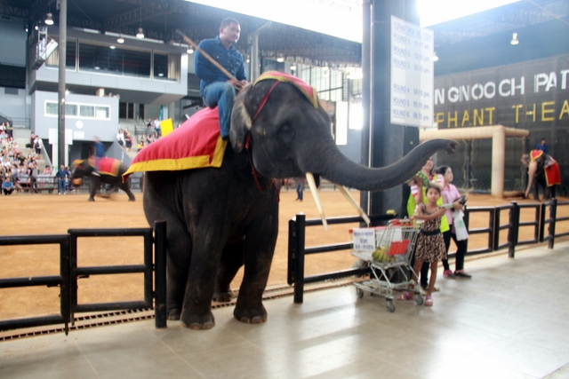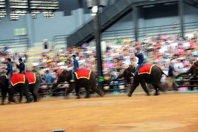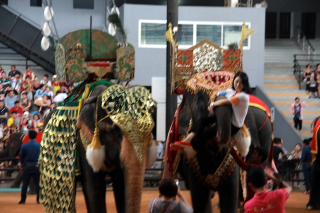 大象也甩呼啦圈,大小十几头大象均匀分布在四面,摇头晃脑,整齐划一。最搞笑的是按摩。不管是男士还是女士,大象总是对着“特殊部位”按摩,一下两下三下,直到被按摩的人发出欢快的叫声为止。大象表演技能多样,乐趣无穷。