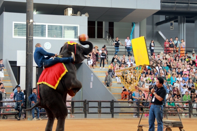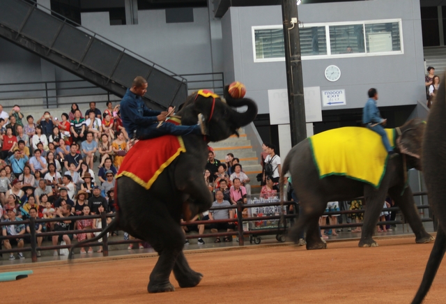 随着世界杯足球赛的音乐声响起,大象开始表演踢足球,有远射,有传球,有近攻,有防守,有进球,比看国足比赛还令人来劲。大象也打保龄球,一场下来,十个能击中七八个。大象还能打篮球。有远投:臀部着地做坐状,前蹄翘起,鼻子卷起篮球,然后扬起鼻子,用力将篮球投出去。万一投不中,干脆带球上篮,灌篮,进球!得意洋洋,向观众鞠躬,讨赏,是香蕉,就卷进口里,是小费,就卷在鼻子下面,绝不会放到口里,卷了一张还可连续卷第二张、第三张……,一起交给“老板”。