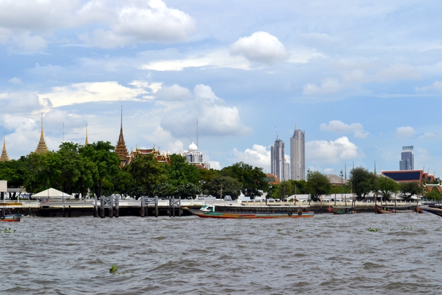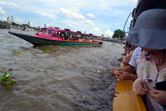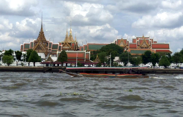 游览大皇宫之前,先坐“长尾船”游览湄南河。“湄南河”是妈妈的奶水之意,亦即母亲河的意思,是泰国的“圣河”。船尖头长尾,类似中国的龙舟。湄南河河水浑浊,游河的目的由原来的夜游两岸霓虹闪烁美景,改为现在的日游,旨在让游客观赏河里的鲶鱼。鲶鱼很多,像公园里养的红鲤鱼,你堆我挤,争抢着旅客投放的食物。鲶鱼很大,每一条差不多都在五七斤以上。说也奇怪,这些鱼就在这一段河里游来游去,上下各五百米,没有围网,水流湍急,就是不游出这个范围。
