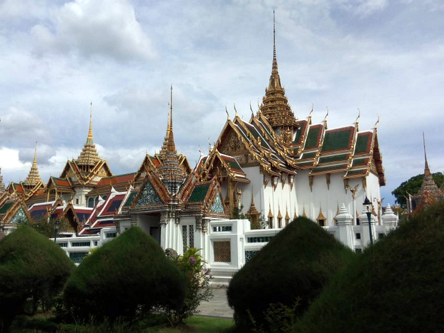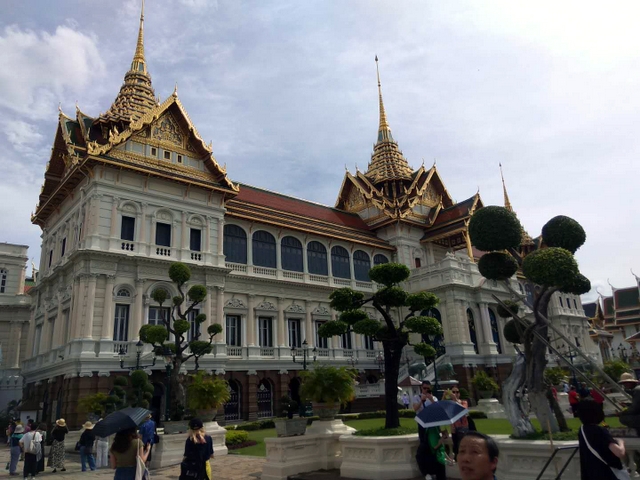 泰国大皇宫也称故宫,是泰国曼谷王朝一世王至八世王的王宫。位于首都曼谷市中心,依偎在湄南河畔,是曼谷市内最为壮观的古建筑群。1782年,曼谷王朝拉玛一世登基开始兴建。1784年第一座宫殿建成,拉玛一世即迁入宫内主持政事。以后历代君主集泰国建筑艺术之精华,不断扩建,装饰也日益宏雄华丽,使其达到了现存之恢弘规模。大皇宫建筑以白为主色,檐角高耸,直插云天;屋顶上面金光灿灿、色彩斑斓;墙壁内外雕梁画栋,美轮美奂;主建筑外围均匀分布涂金神话人物和吉祥动物;庭园内绿草如茵,鲜花盛开,树影婆娑,满目芳菲。