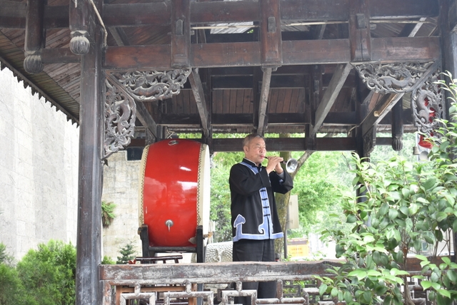 在土司城的大门口,穿着民族服饰的土家汉子擂起迎宾鼓,吹起唢呐,以土家族的礼节表示对来客的热烈欢迎。