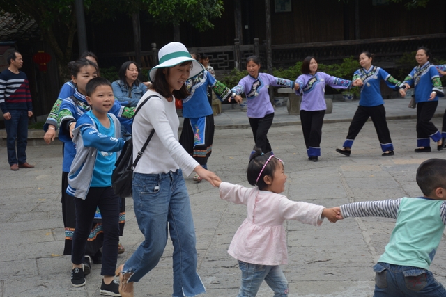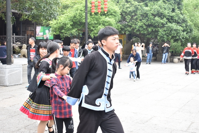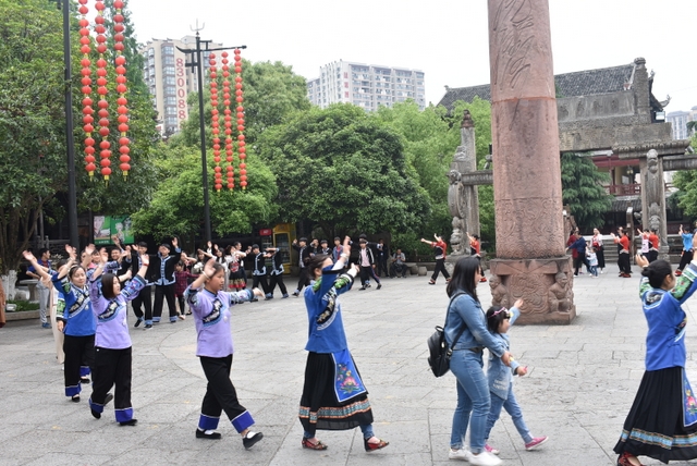 老师们站在舞圈外,看得津津有味,纷纷拿出手机拍照。看着看着,不少老师心痒痒的,也加入了摆手舞队伍,跟着那些土家舞者舞动起来。