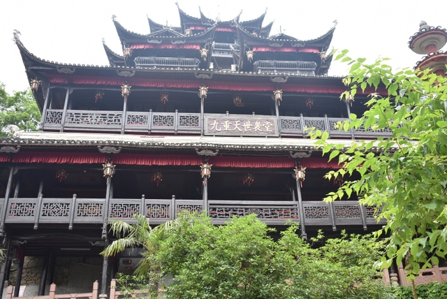 九重天世袭宫高48米,共9重12层,整个楼房全部用木栓连接,没有一颗铁钉,堪称土家族建筑史上的奇迹。2002年9月22日,九重天吊脚楼被载入世界吉尼斯世界纪录,认定其为目前中国最大、最高、最完美的木质结构吊脚楼。楼内陈列有多种承载湘西土家文化符号印记的物件,如绣花衣服、绣花鞋子、银器、放盅、赶尸等,这些物件,无不透露出土家人为了生存与自然作斗争的智慧。