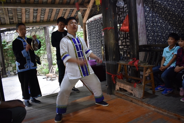 今天现场的摆手舞动作并不复杂,但配合跳舞人的服饰,加上摆手堂环境的渲染,却显现出一种低调的大气,欢快而从容。