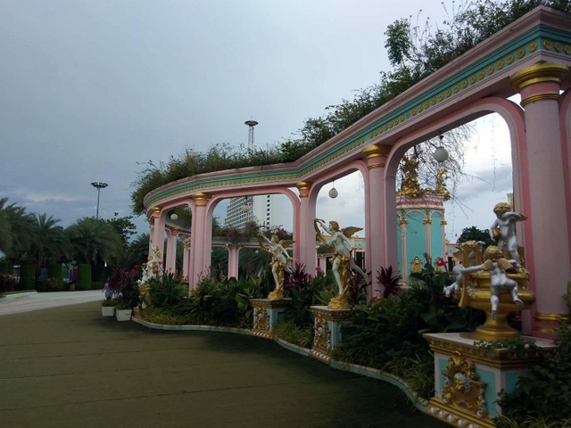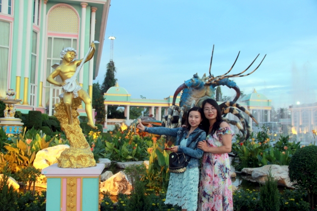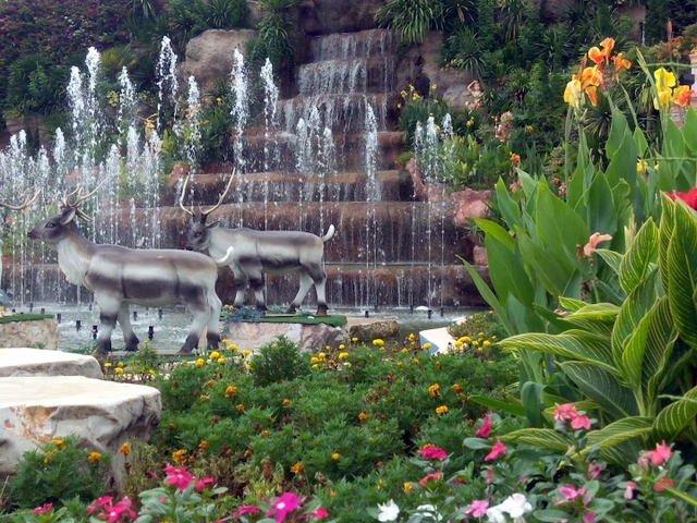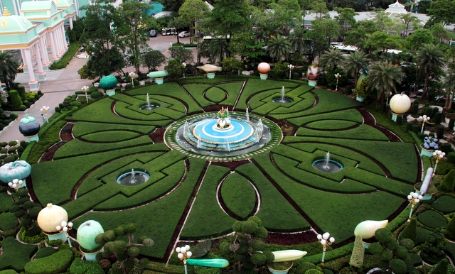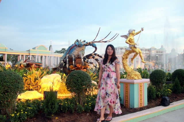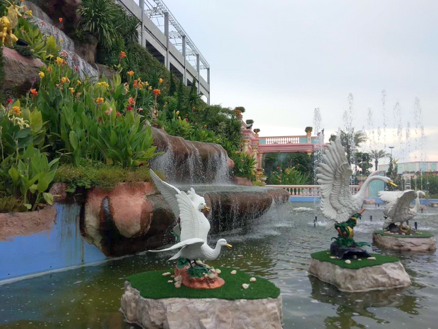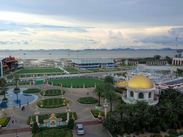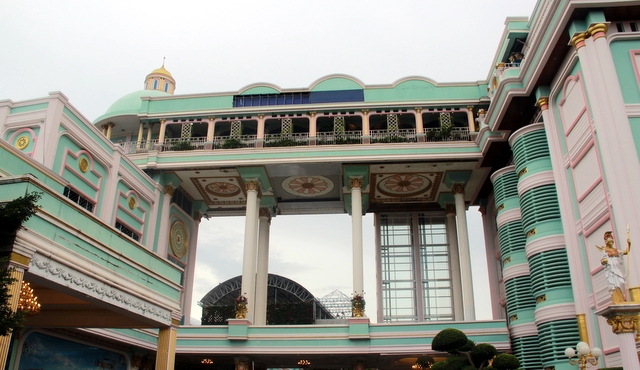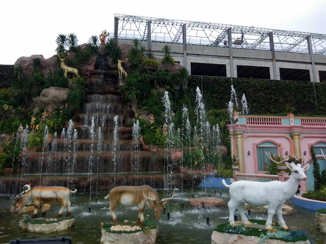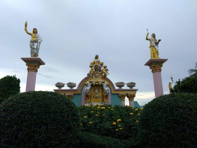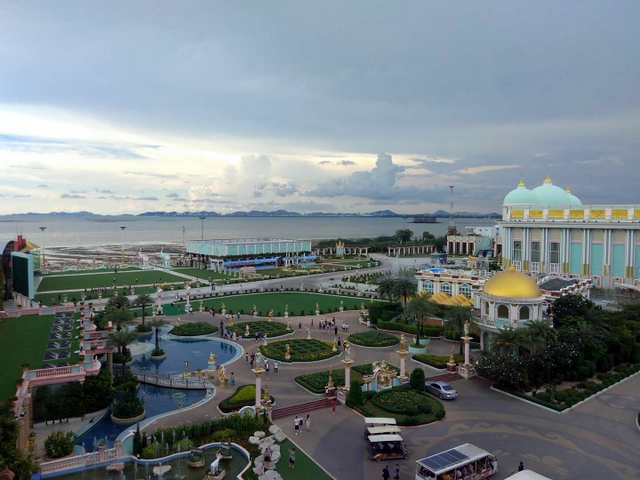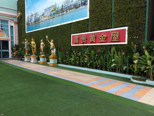 庄园濒海而建,占地18万多平方米。一进庄园大门,便有一只孔雀迎面而来,看到俊男靓女,立即开屏,争奇斗艳。庄园十分气魄,就像一座宫殿,雕梁画栋,金碧辉煌。无论室内,还是室外,雕塑遍布,各种动物,各类人物,全都黄金涂饰,极尽奢华。