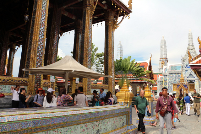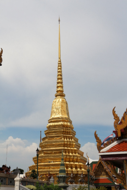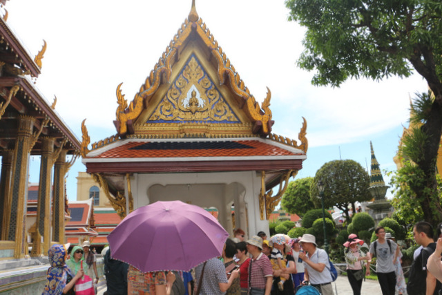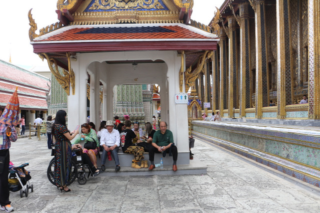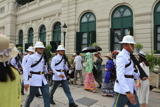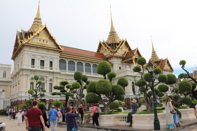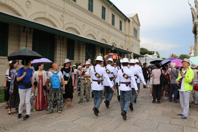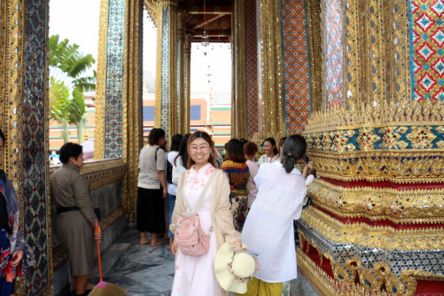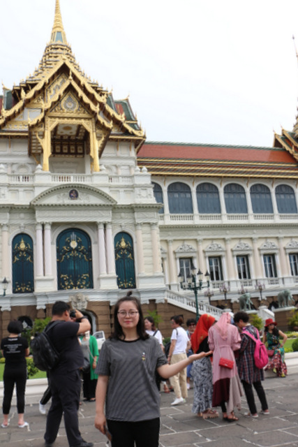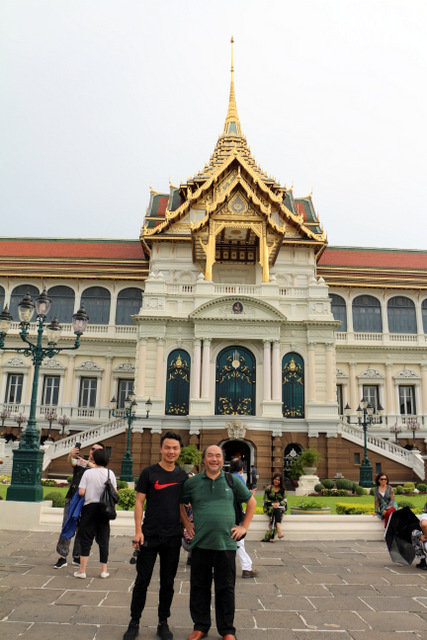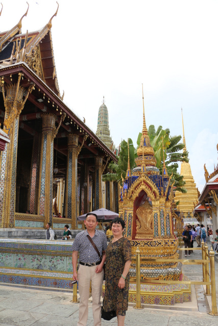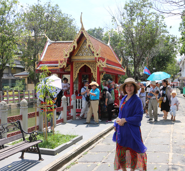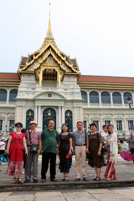 皇室是泰国的政治、文化核心。大皇宫始建于1782年,经历代国王的不断修缮扩建,现在是曼谷中心内一处大规模古建筑群(计28座),总面积218400平方米。紧邻湄南河,大皇宫汇聚了泰国的建筑、绘画、雕刻和装潢艺术的精粹。其风格具有鲜明的暹罗建筑艺术特点,深受各国游人的赞赏,被称为 “泰国艺术大全”。更是泰国用于举行加冕典礼、宫廷庆祝、外交等仪式和活动的最重要的场所。平时对外开放,也就有了我们今天的一路期待。在皇家讲解员的带领下,参观了金碧辉煌的宫殿群,了解了传奇的历史人物故事,惊叹之余不由新生敬仰。诚心祈福后,众多游人,多手持莲花点圣水,祈福平安、健康、好运随。