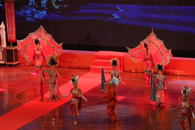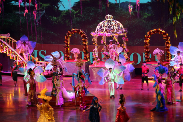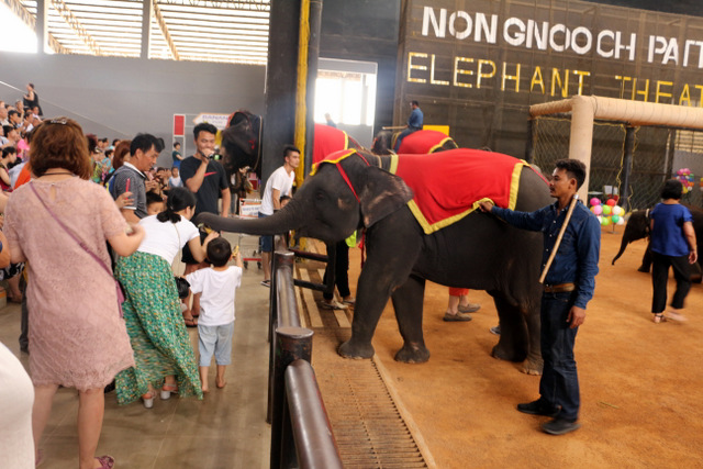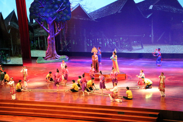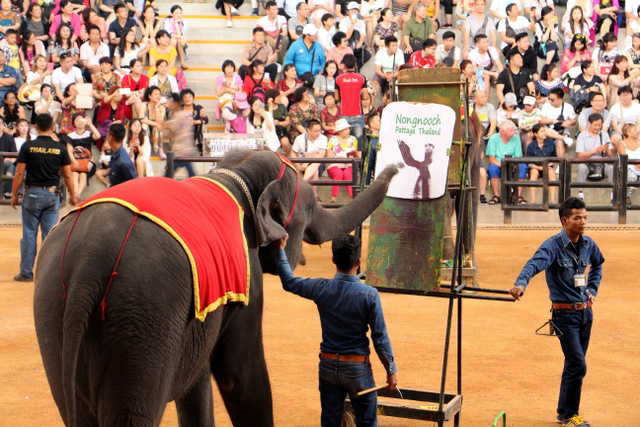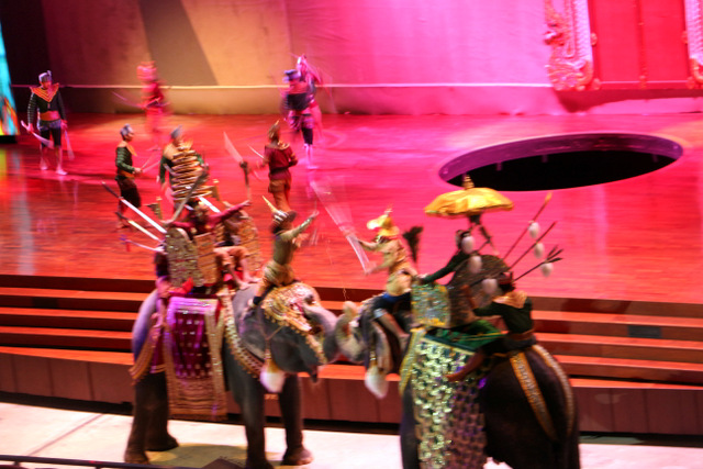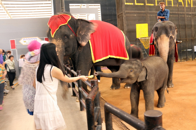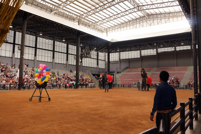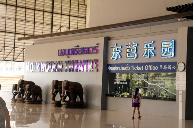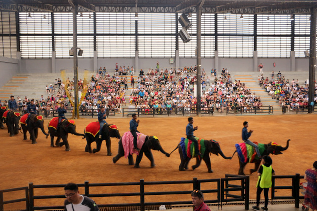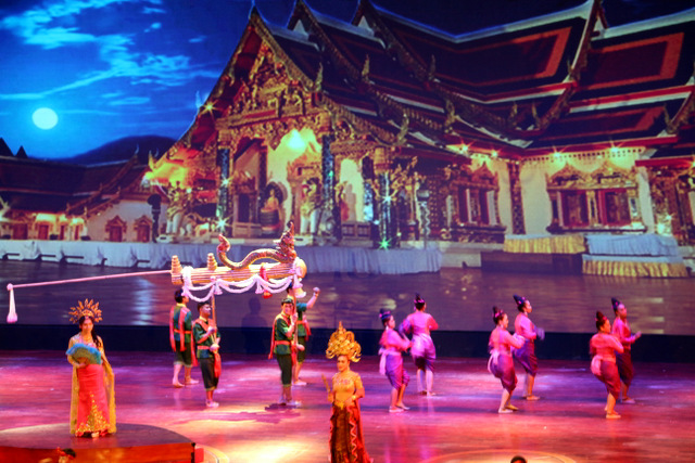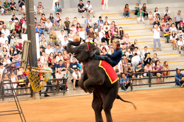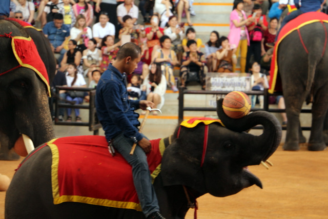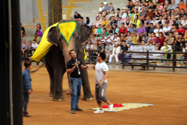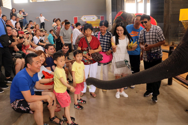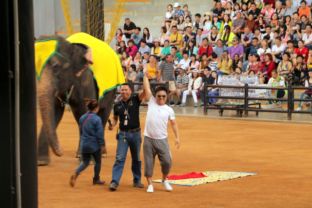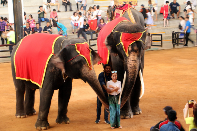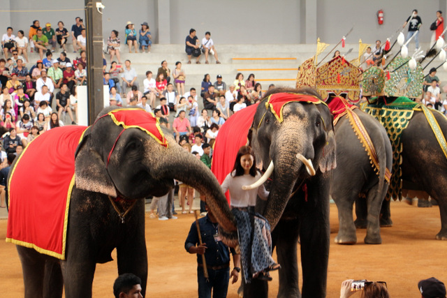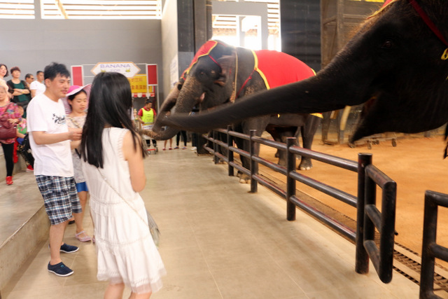 下午老师们来到了东巴乐园。东芭乐园占地1600多亩,是一个泰式乡村风格的休闲兼度假公园。观赏体验东芭乐园内的节目主要有泰国的民俗表演、大象表演二大部分。民俗歌舞很质朴地道,表演者就是村寨中人。瞅,那仿真舞台上的妹子民歌婉转,舞姿优美,对望深情脉脉,阿哥号角声声,擂鼓震天,雄壮豪迈,气势如虹。泰国的国粹泰拳表演逼真而不失诙谐幽默。大象环节的表演格外精彩,总能引人入胜。观众与大象的直接互动,如抱坐大象鼻子、给大象喂香蕉(花20泰铢就能拿一串的香蕉),给大象发发小费等,让大家尖叫连连,勾得胆大的游人们跃跃欲试。还有大象群体打篮球,踢足球,列队表演等活动也是精彩连连。
