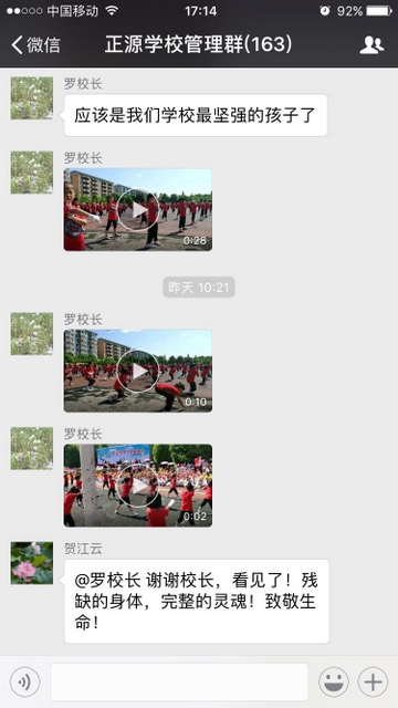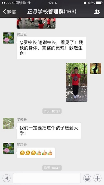 罗校长得知情况后,很感动,也很激动,他从主席台来到表演区,手机镜头对着张玉月,动情地欣赏着孩子精彩的表演,眼神中流露出慈父般怜爱。他说:“这应该是我们学校最坚强的孩子了!我们一定要把这个孩子送到大学!”
