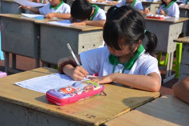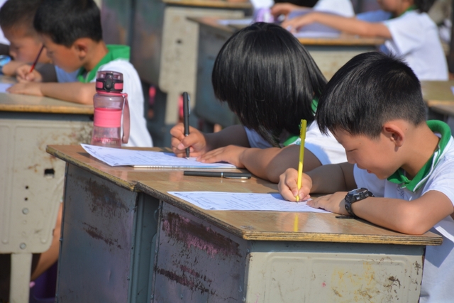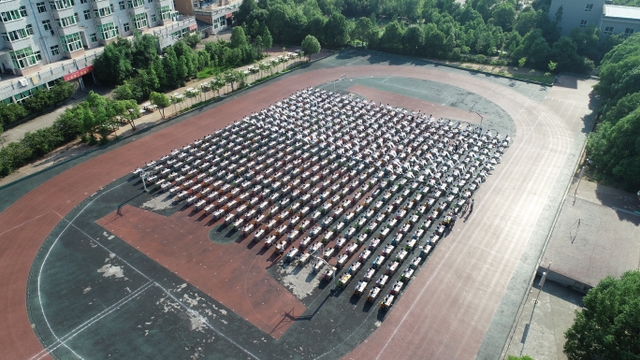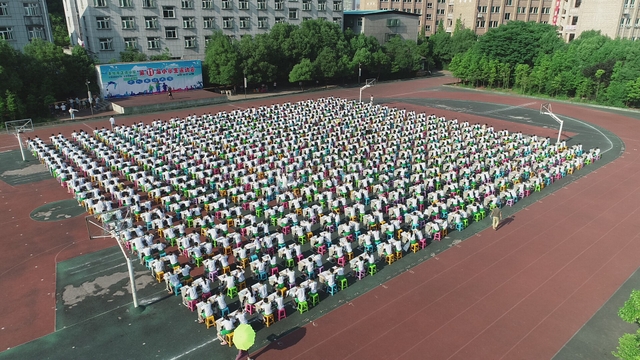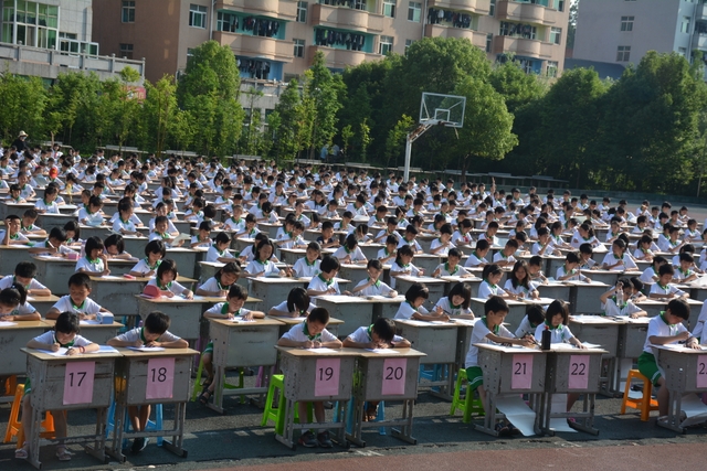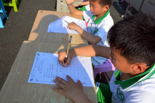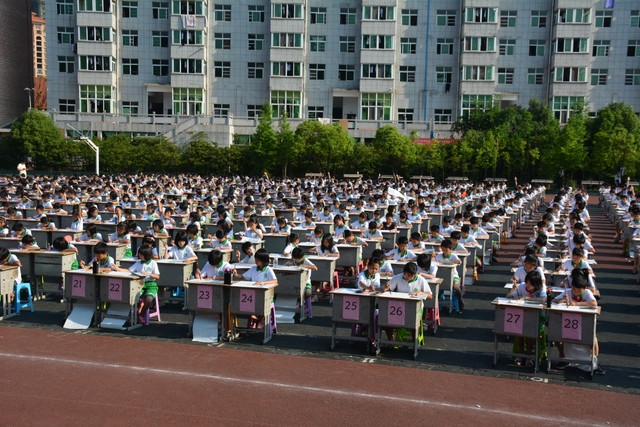 为了能准时开始比赛,清晨6:45五六年级的班主任带着班上的孩子们开始搬桌子。运动场摆放着一排排整齐的桌椅,横25列,纵40列,场面颇为壮观。而一切都在有序进行着,7点半,领队及监考老师们已带着参赛者有序入场。