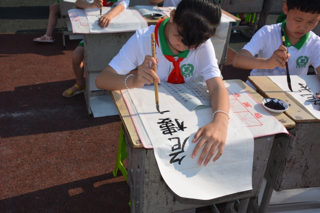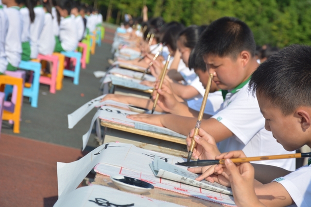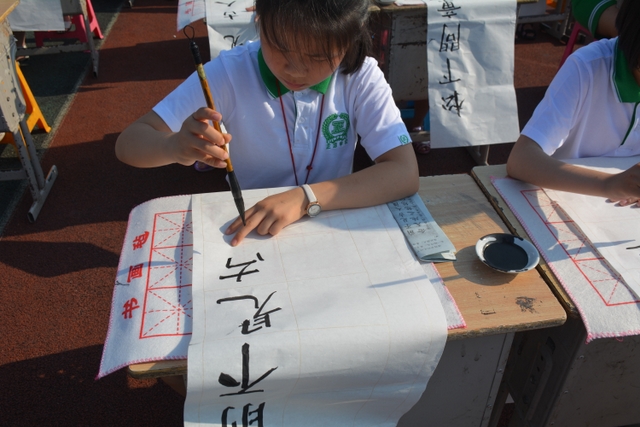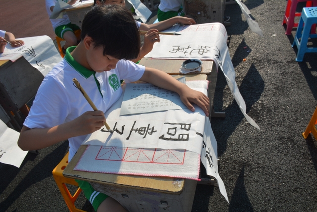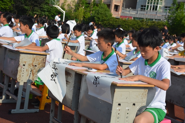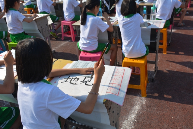 5月17日上午,小学部第二届千人现场书法大赛在小学部运动场如期举行。此届书法大赛共有整整1000名同学参加,其中参加硬笔书法的1--3年级的学生有500人,参加软笔书法的4--6年级的学生也是500人。他们都是从各年级海选中脱颖而出的优秀选手,都有一定的书写水平,所以这是强者的较量。