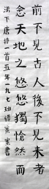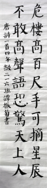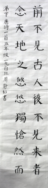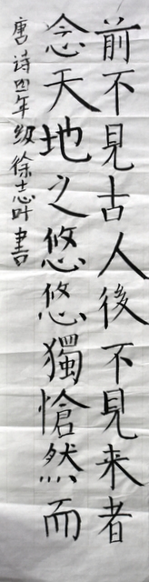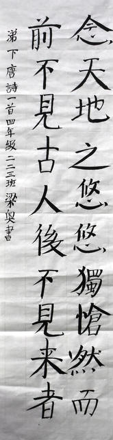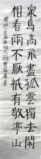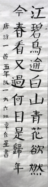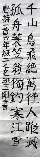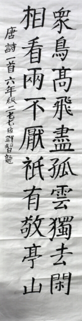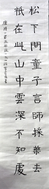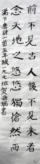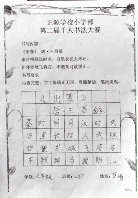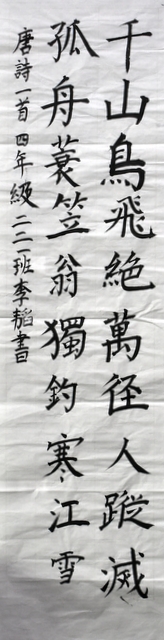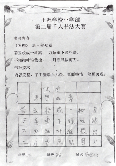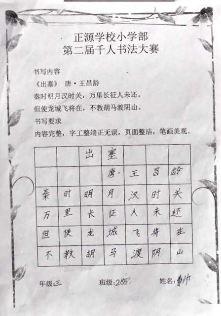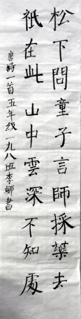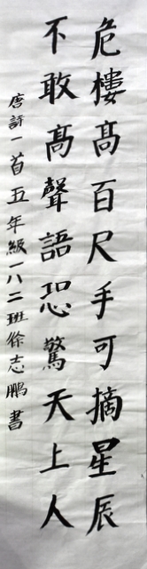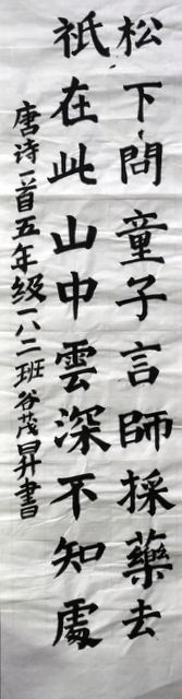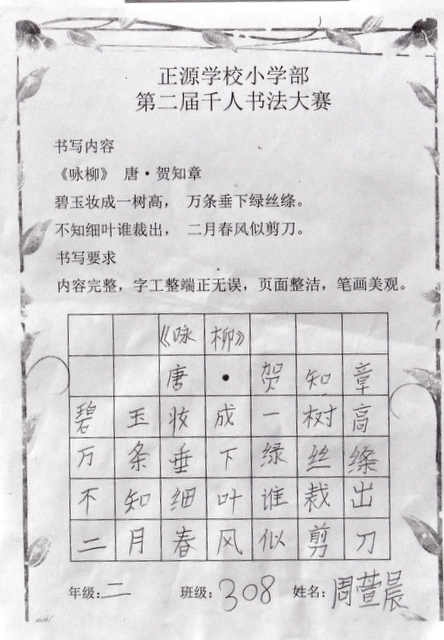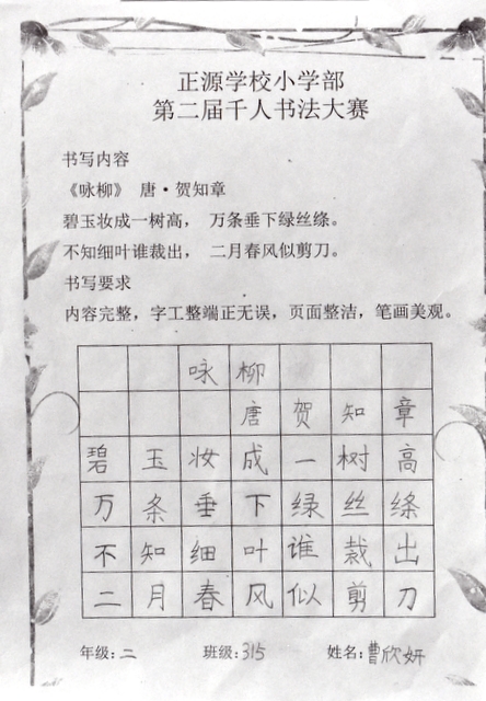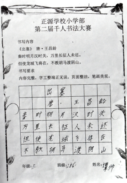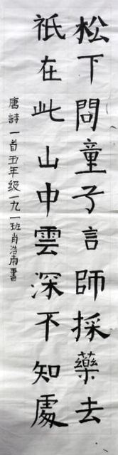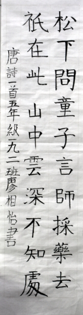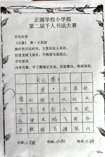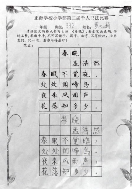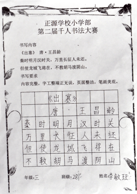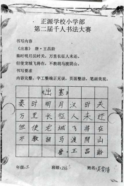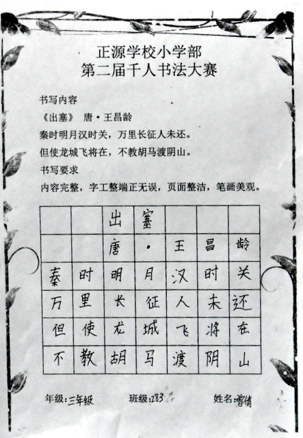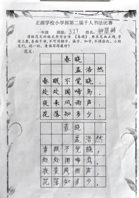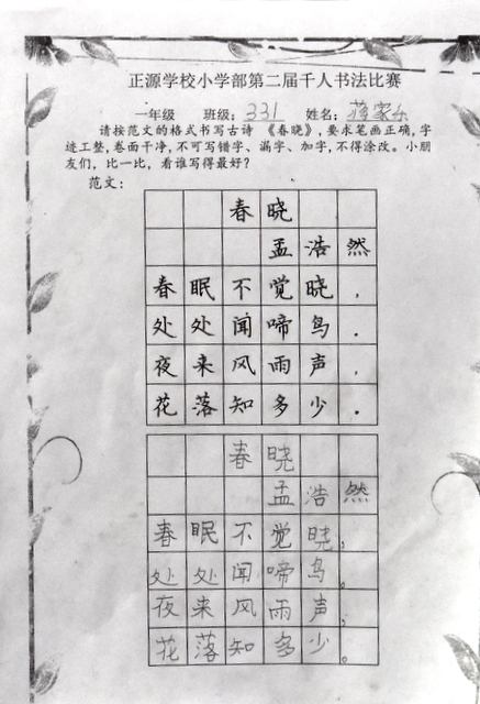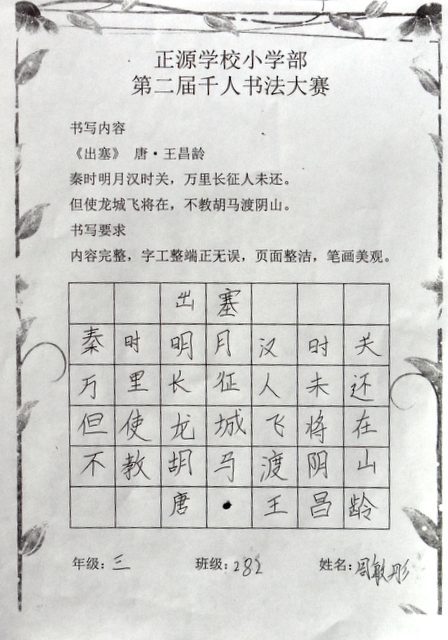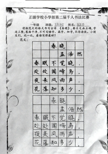 8点整,由主持人宣读比赛规则并宣布比赛正式开始。参赛者们看了试题和要求,心中略作思考,便开始提笔了。一年级的比赛内容是抄写孟浩然的诗《春晓》;二年级和三年级的比赛题目则分别是用楷书书写唐诗《咏柳》《出塞》;小学高年级组的同学们比的是软笔书法,命题创作,从六首唐诗中选择一首用颜楷书写一幅作品。伴随着轻音乐的节奏,同学们自信满满,一笔一划,那么入神地写着。不少同学功力不凡,写得端正又美观。顿时,把我也带入了美的情境里了,真为他们感到高兴。古人云:一份耕耘,一份收获。多亏了老师们平时的悉心教导和孩子们的不懈努力。