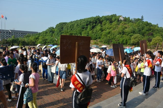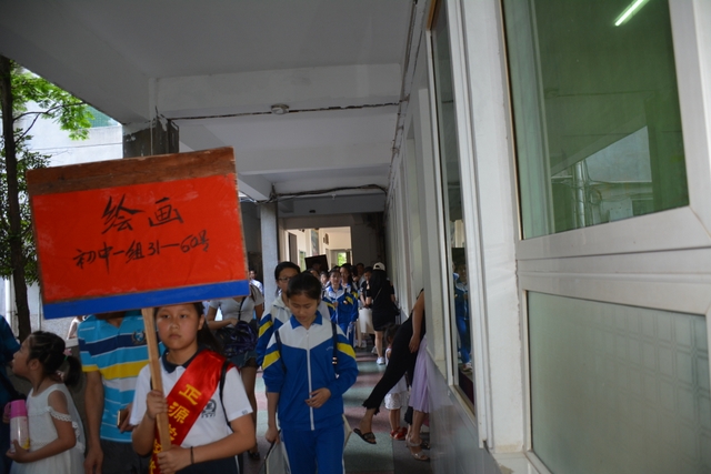 正源学校的学生志愿者、一百多名初中学生,身着夏季校装,佩挂绶带,分布在南校门及相关路口、场点接待参赛学生和家长,保证学生顺利进入赛场,准时参加比赛。
