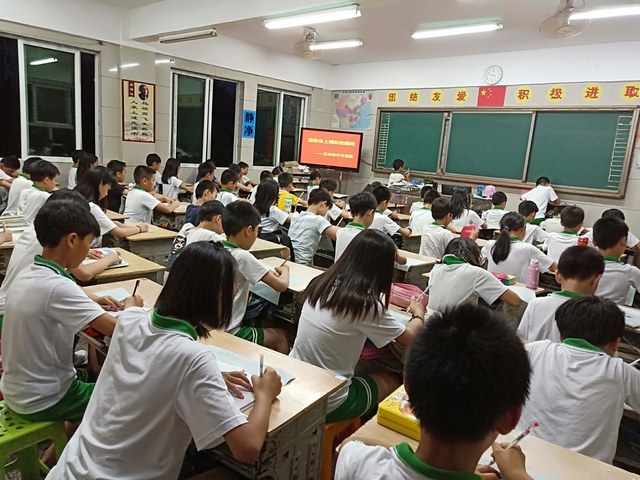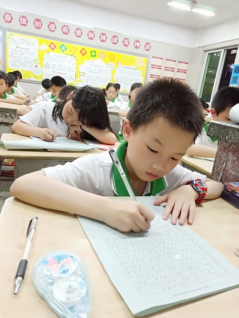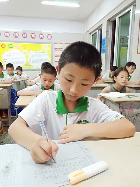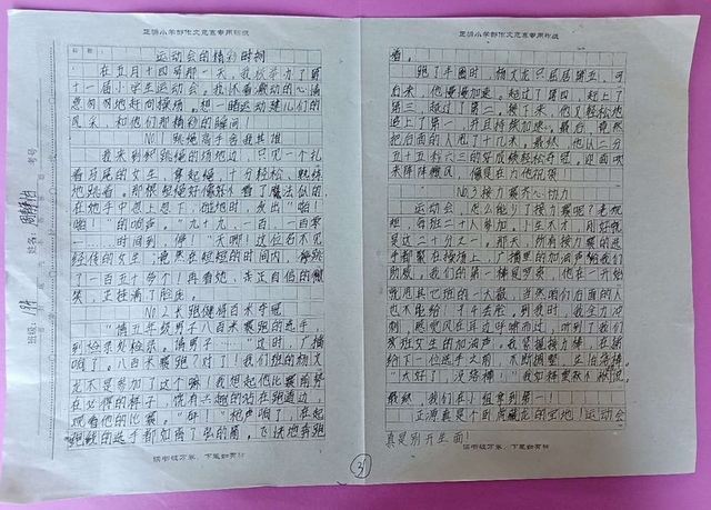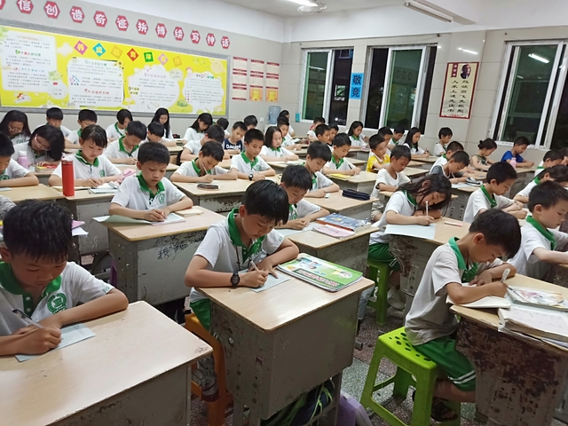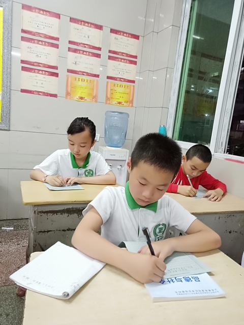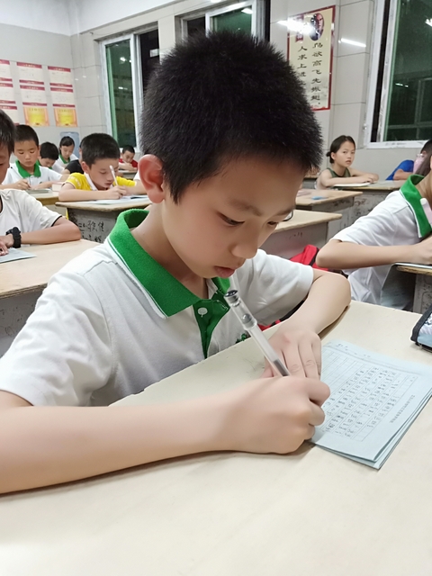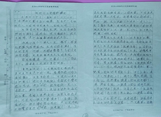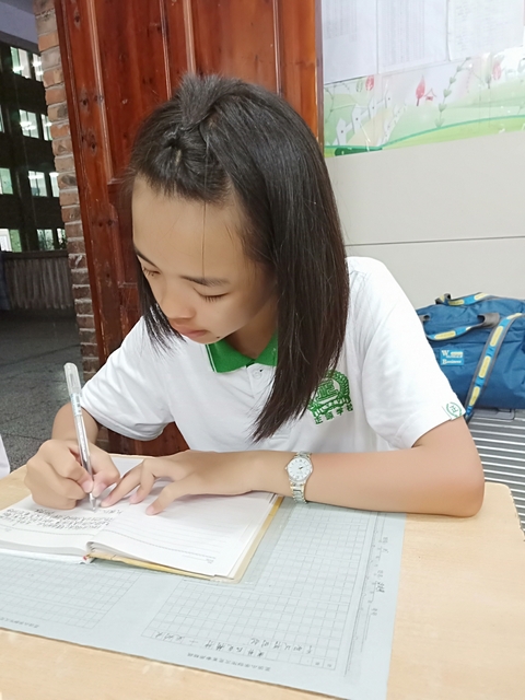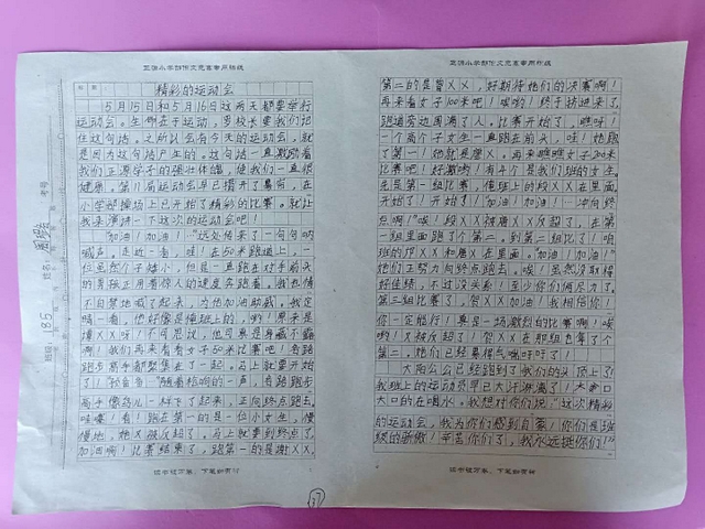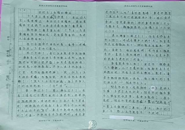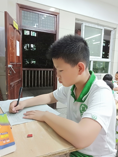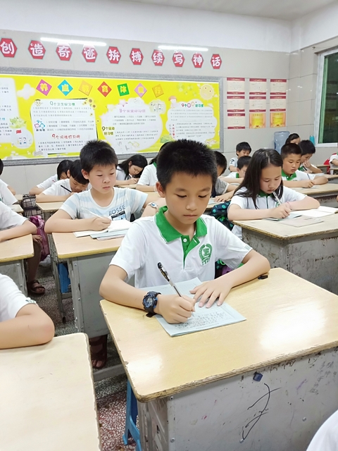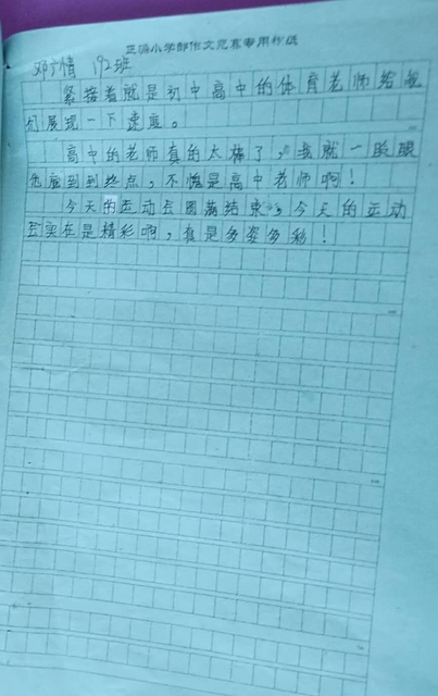 吃过晚饭后,学生们穿着崭新的校服早早来到教室,摆好桌椅似乎盼望着竞赛的早些到来。7点整的上课铃声一响,教室里鸦雀无声,学生们手里拿着笔,低着头忙起了写作,完全不顾及流到脖子上的汗珠。他们忽而紧蹙眉头,忽而笑容舒展,忽而停笔凝思,忽而笔耕不辍,运动会上的一幕幕像过电似地在孩子们脑海中闪过,或许这就是最真实的记忆,最难忘的精彩!