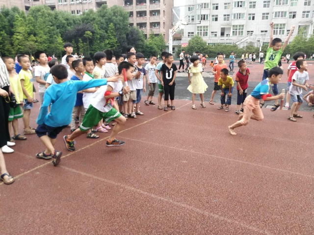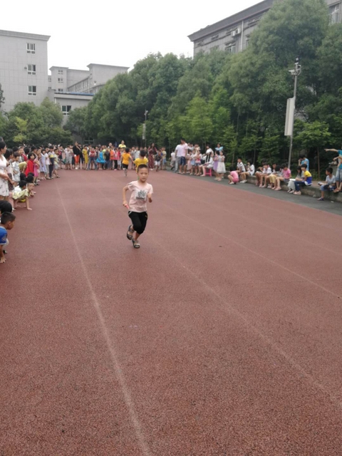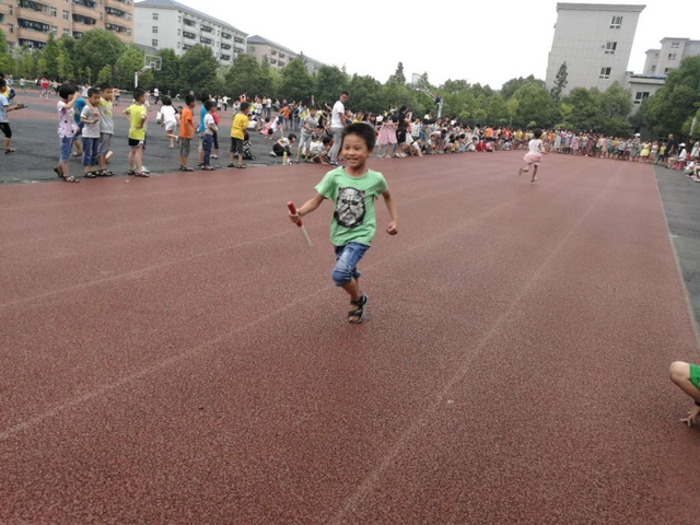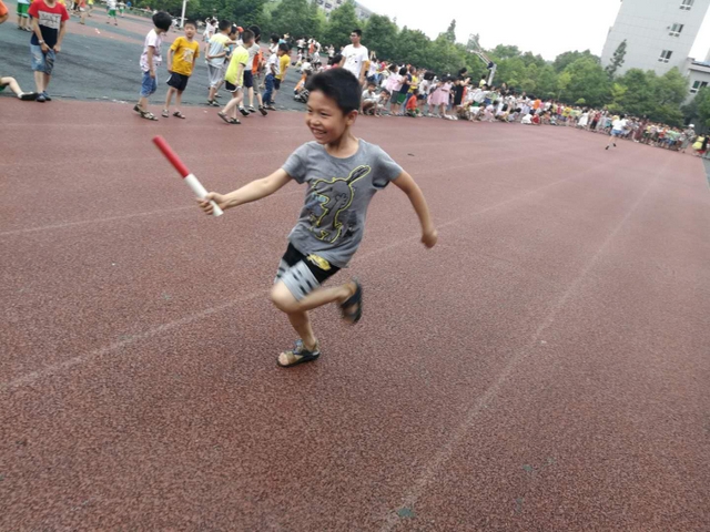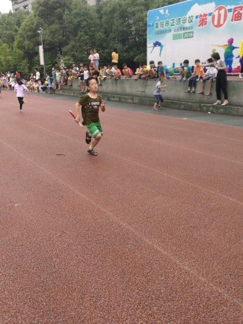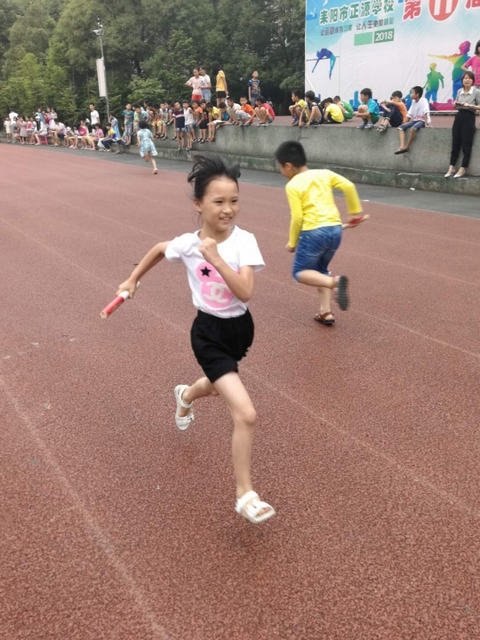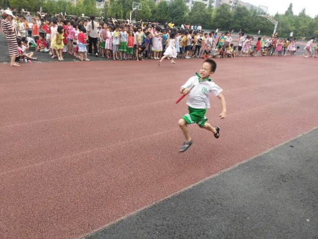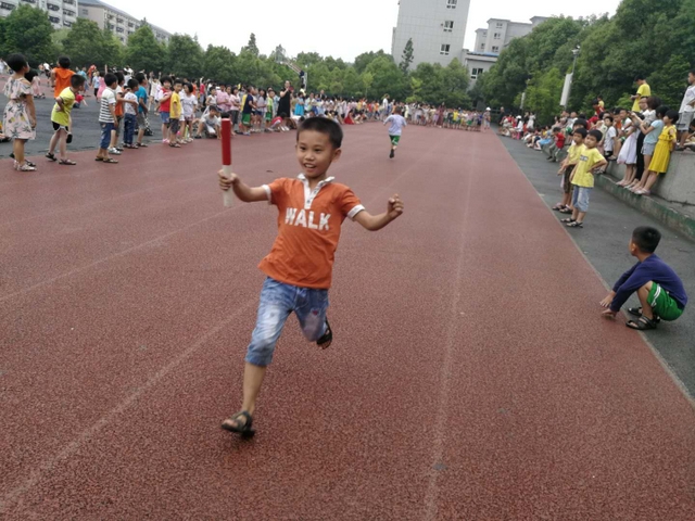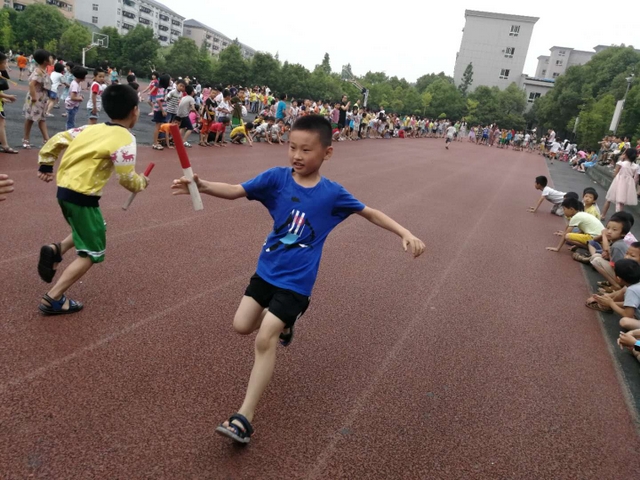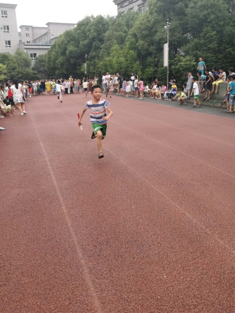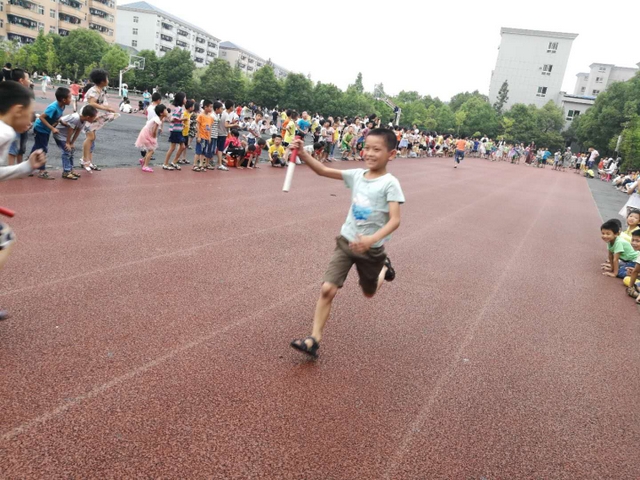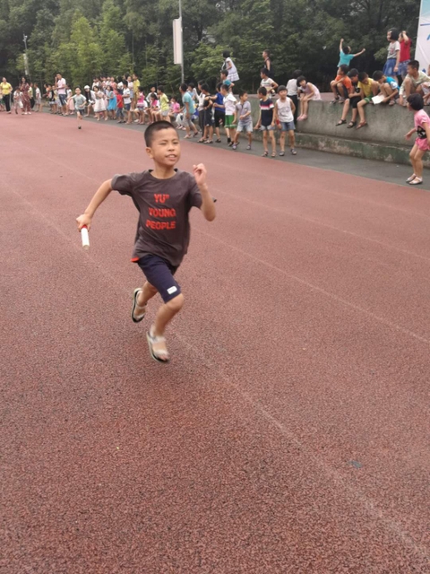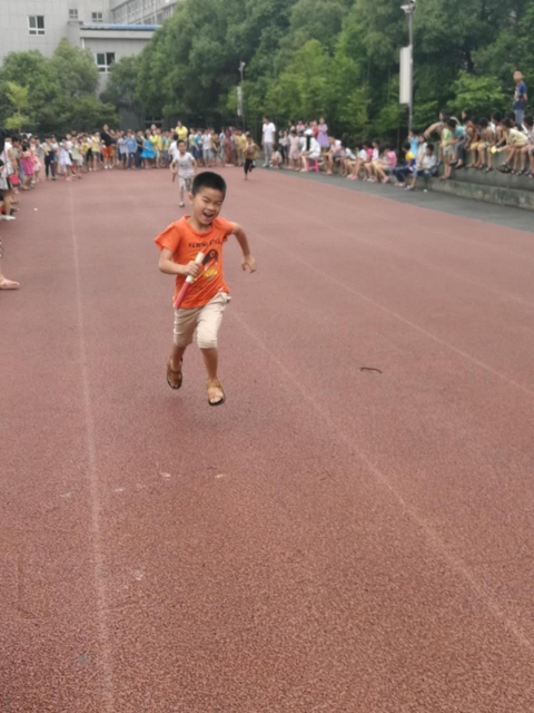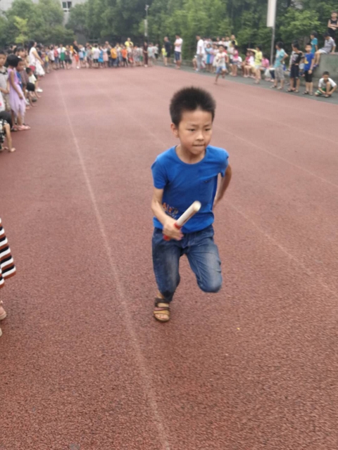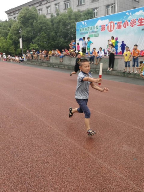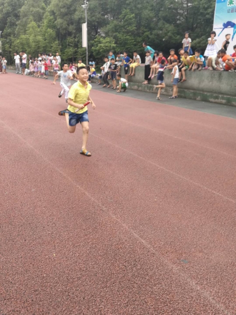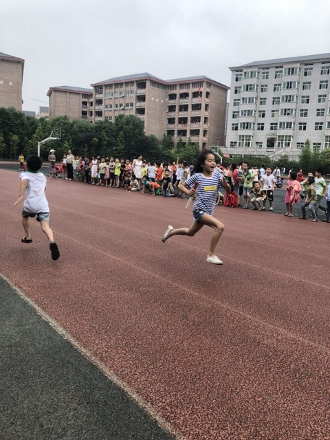 “各就各位——预备——跑!”随着一声令下,操场上顿时沸腾起来。首棒运动员像离弦的箭,一下子就冲出起跑线。在一片加油声中,他们争先恐后,你追我赶。孩子们呐喊助威,呐喊声响彻校园的每个角落,此起彼伏,震耳欲聋,热闹非凡。308班的“飞毛腿”谭超和310班的“短跑小将”罗鸿亮,他们像脱缰的野马,不顾一切地向前冲,脸都憋红了,遥遥领先的他们赢得了同学们的阵阵喝彩。再看306班的小运动员邝靖宇,不知什么原因,落后一大截,同学们恨不得伸出手拉他一把。“屋漏偏遭连夜雨”,小将王诗彤摔倒了,只见她快速爬起来,皱着眉,抿着嘴,胸脯高高抬起,额头高高扬起,继续拼尽全力向前冲!307班的运动小将徐诗清传棒给李若妍时,接力棒出乎意料掉在地上,同学们大惊失色,急得大叫:“快!捡起来!快传!”排名时刻在变化,差距时刻在变化…… 随着小运动员们一次次穿梭,交棒,接力赛迎来第一组最后一棒——冲刺!十米,九米,三步,两步……“耶——”307班最后一棒的小将陈浩宇率先跑到终点!场上的啦啦队们不约而同发出一阵欢呼声。