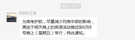 四是取消可能对高考学子造成影响的活动。小学部四年级:为高考护航,尽量减少对高中部的影响,原定于明天晚上的英语活动推迟到6月8号晚上(星期五)举行,特此通知。