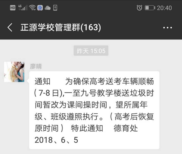 德育处也发出告示:7--8日,一至九号教学楼垃圾运送时间暂改为课间操时间,望所属年级、班级遵照执行。高考后恢复原时间。