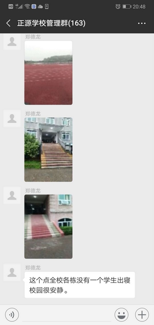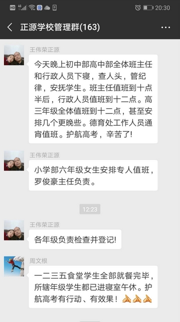 五是确保晚上高三考生休息良好。060612:19王伟荣(学校德育主任): 今天晚上初中部高中部全体班主任和行政人员下寝,查人头,管纪律,安抚学生。班主任值班到十点半后,行政人员值班到十二点。高三年级全体值班到十二点,甚至安排几个更晚些。德育处工作人员通宵值班。护航高考,辛苦了!