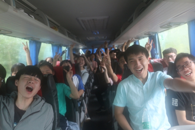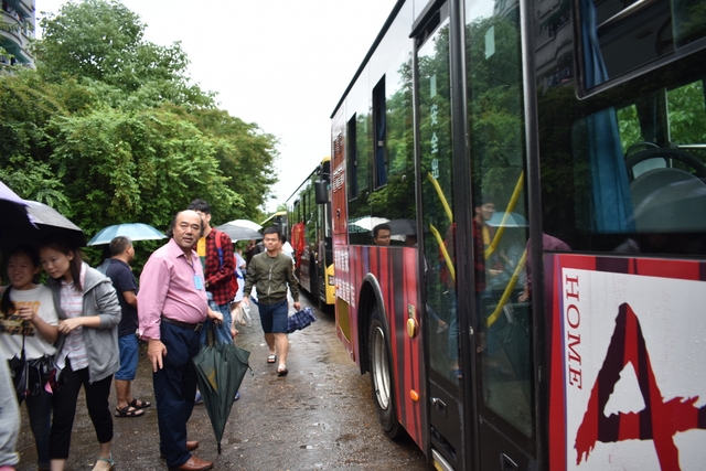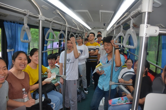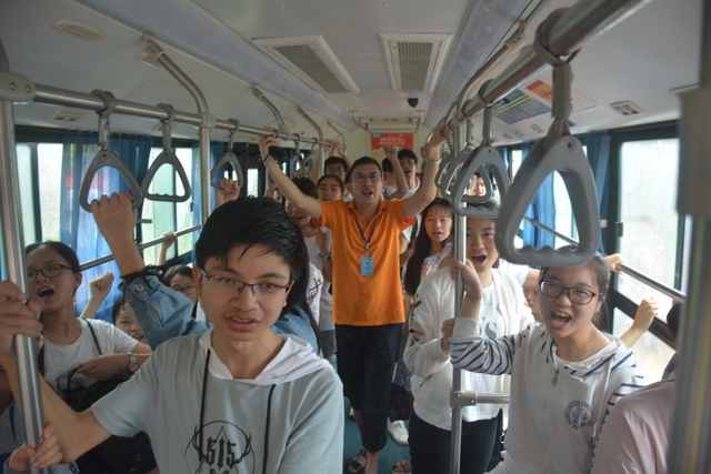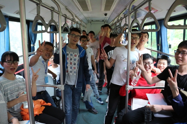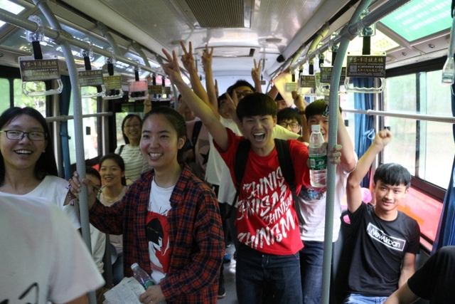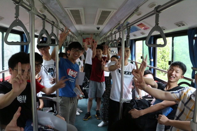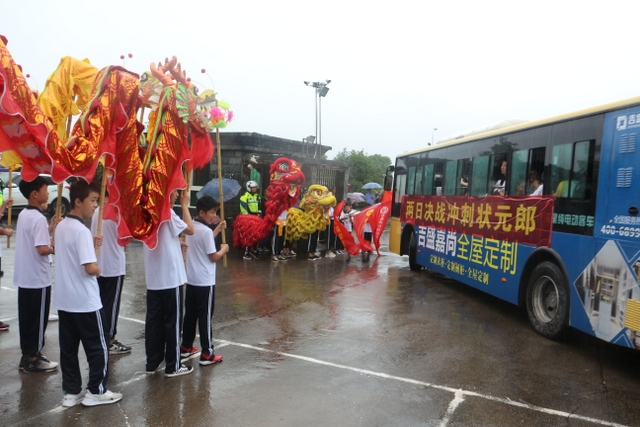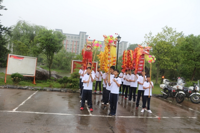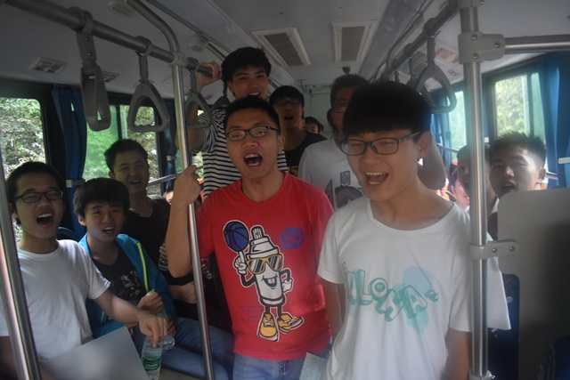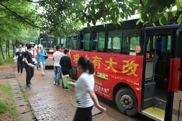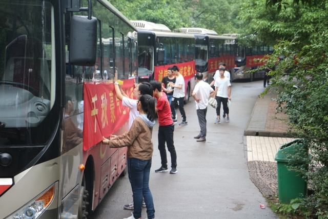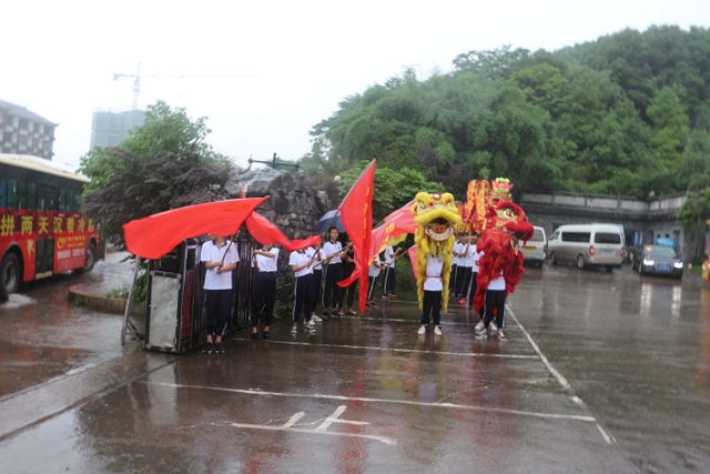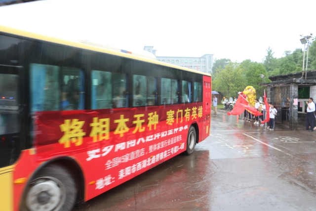 八点零八分,罗校长、梁晓芬总监的两台车打头阵,四十台大巴车宛如一条见首不见尾的神龙,载着1511名高三考生,逶迤向着南校门驶去,四条金龙和两只雄狮分列校门两侧,为高三学子壮行。