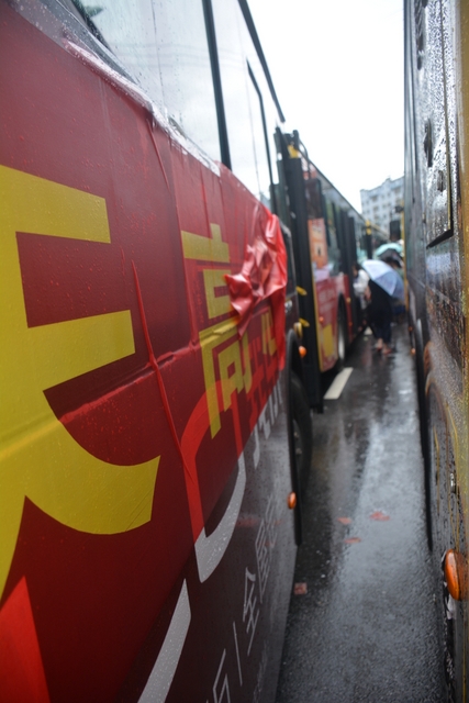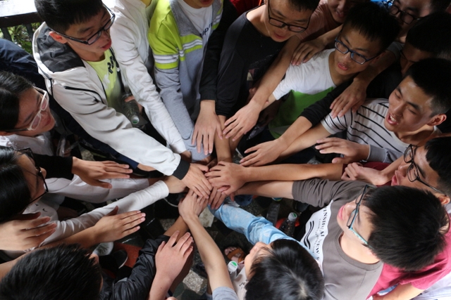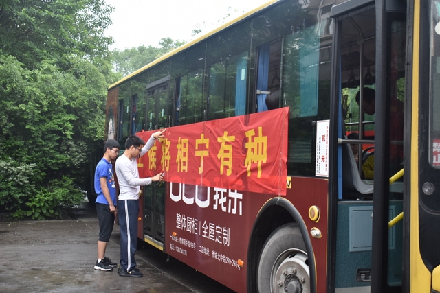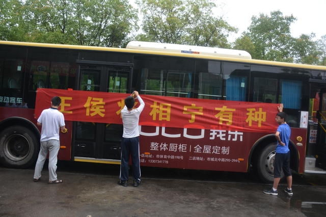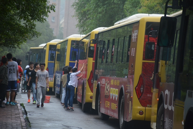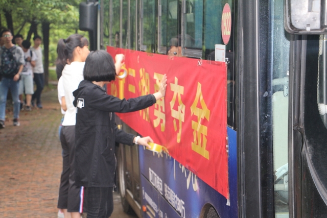 早上七点钟,高二的同学们还没吃早餐,就忙着给学哥学姐们的高考用车张贴标语。尽管雨水打湿了衣服,同学们也乐此不疲,毫无怨言。