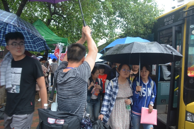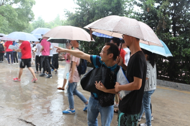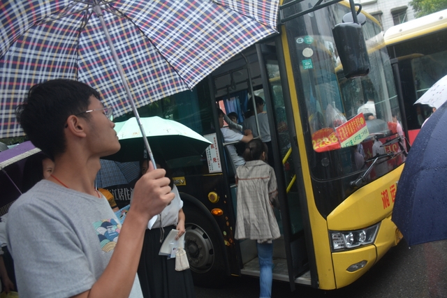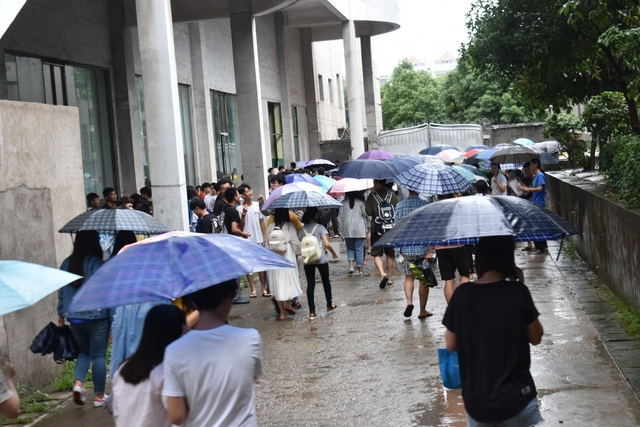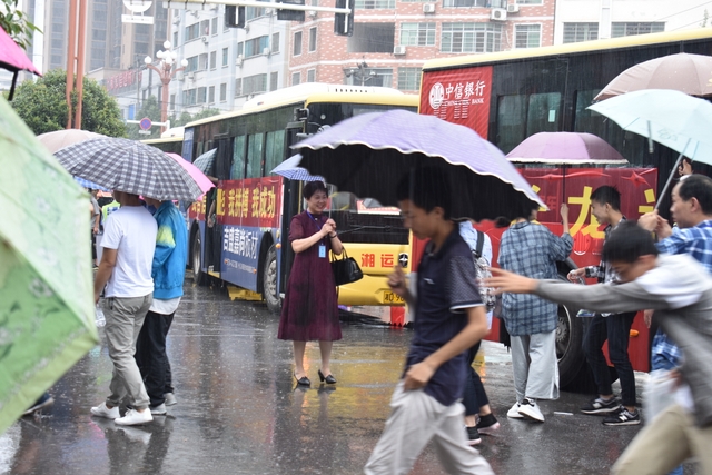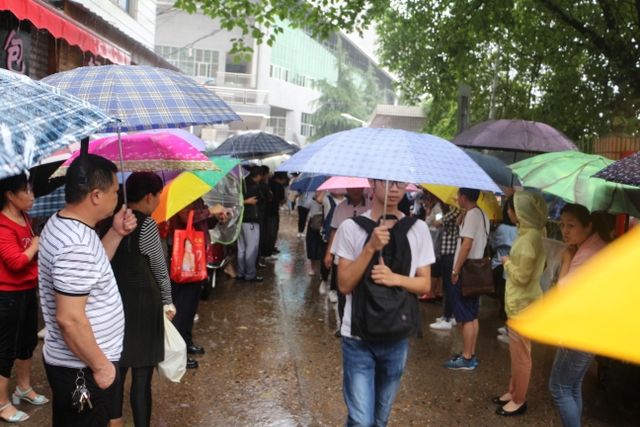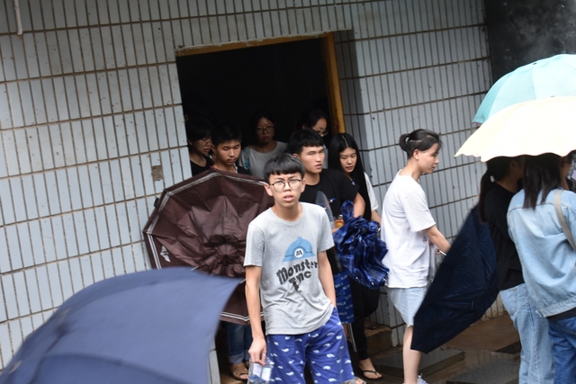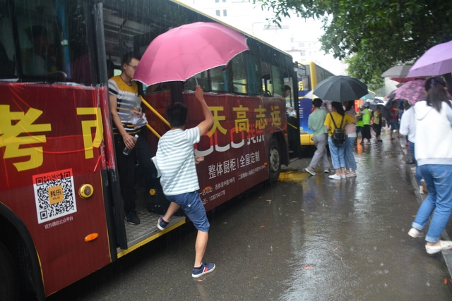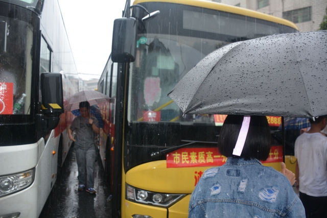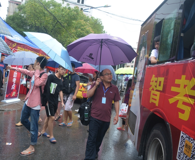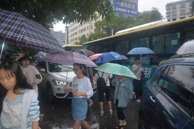 到达考点,雨已下得很大,部分同学没有带雨伞,带队老师便把自己的雨伞让给学生,执勤民警纷纷用自己的雨伞将一个又一同学送进考室。