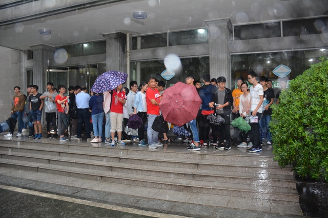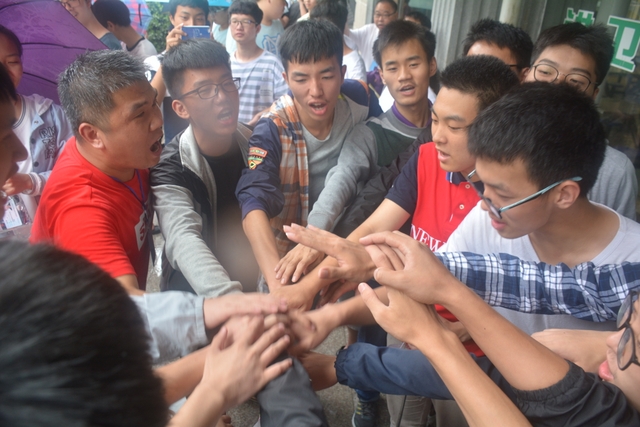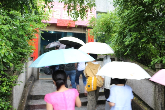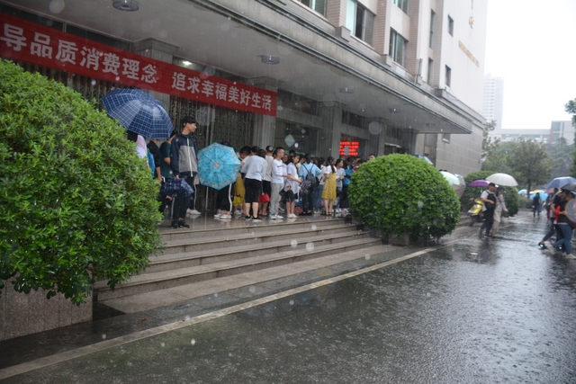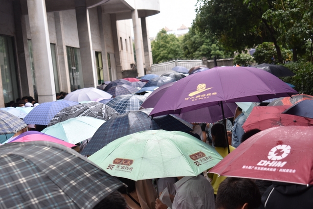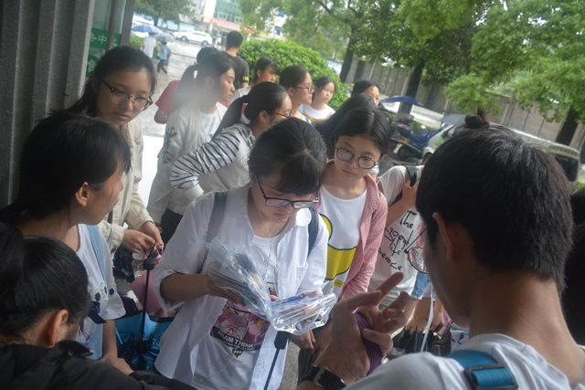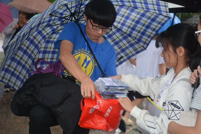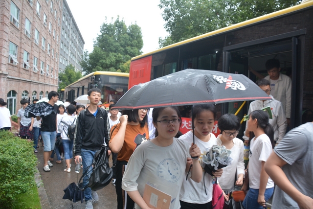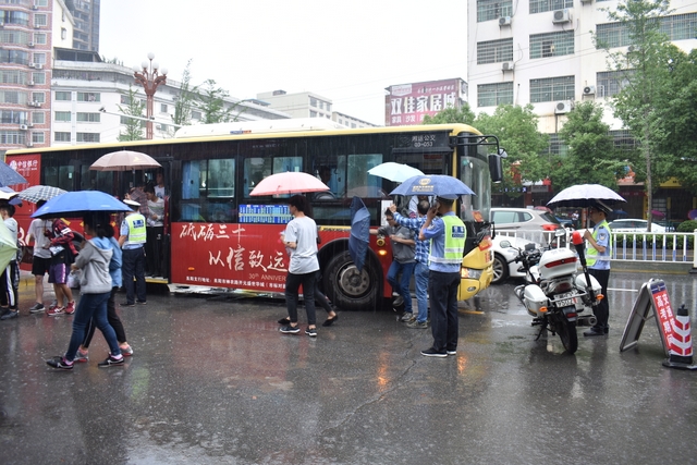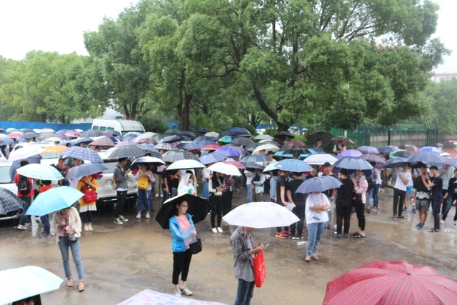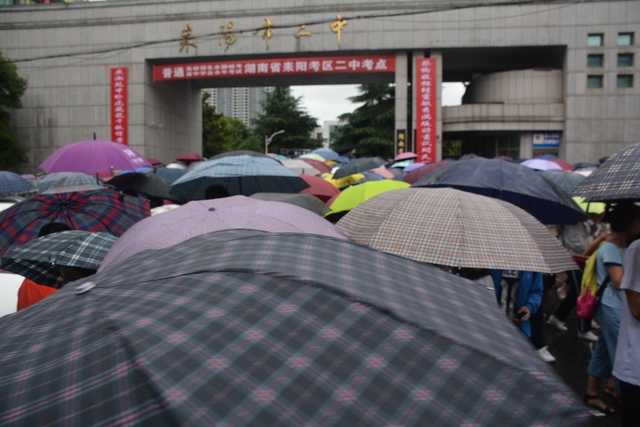 到达考点,雨已下得很大,部分同学没有带雨伞,带队老师便把自己的雨伞让给学生,执勤民警纷纷用自己的雨伞将一个又一同学送进考室。