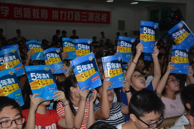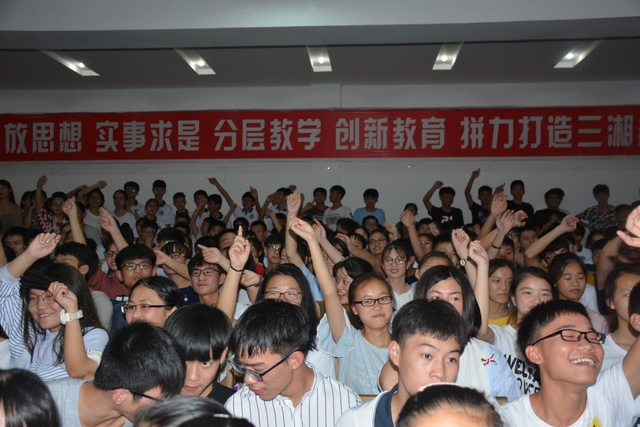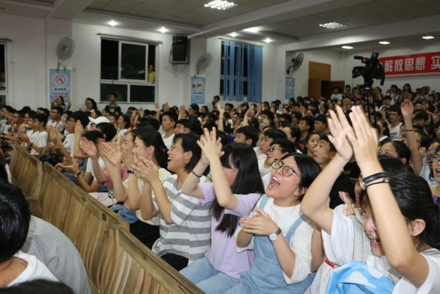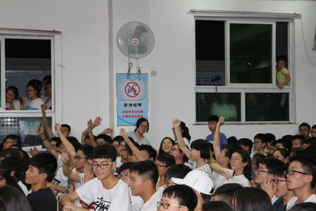 欣赏完热情劲爆的开场舞《极乐净土》后,比赛正式开始了。在四位主持人指挥下,现场的啦啦队员们都使出浑身解数,为自己的班级加油打气。他们的口号,个个独出心裁;他们的声音,响彻云霄!其中,143班的同学们在为班级助威时,满怀热情地称呼王主任为“小火山”,流露出浓浓的师生情,而153班的同学更是人人举起了一本“5.3”,在呼号的同时也不忘幽默一把,令老师和观众们大开眼界。