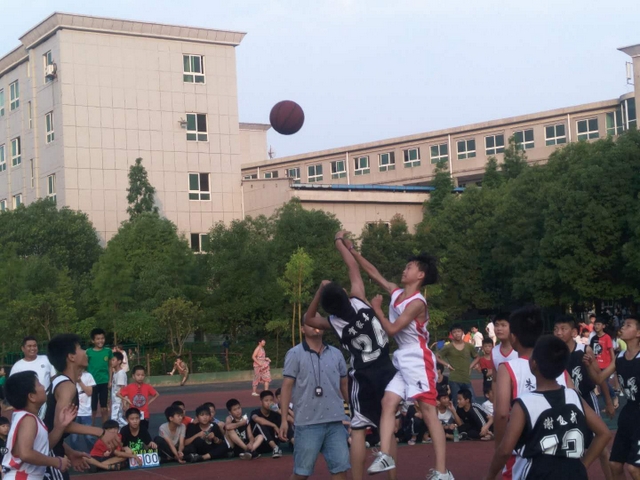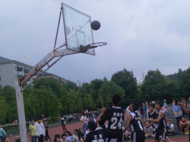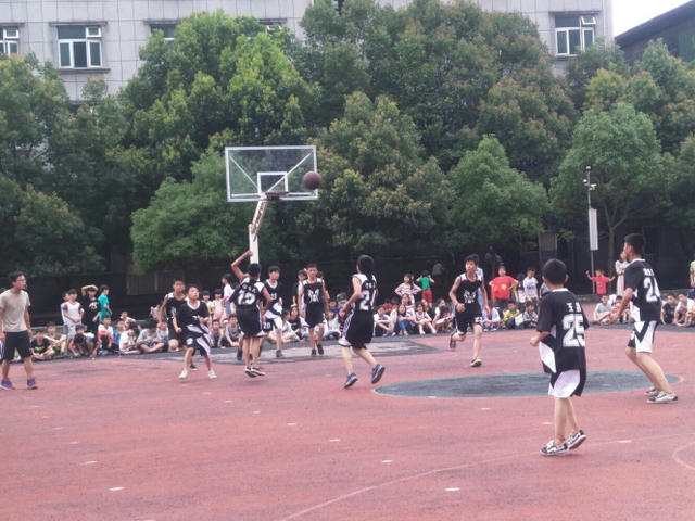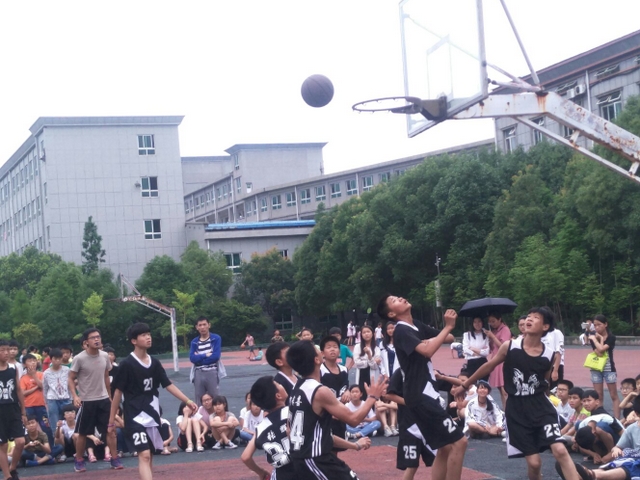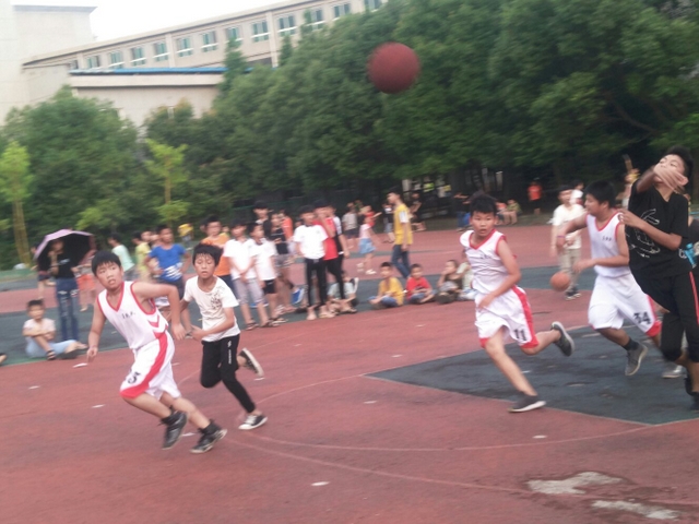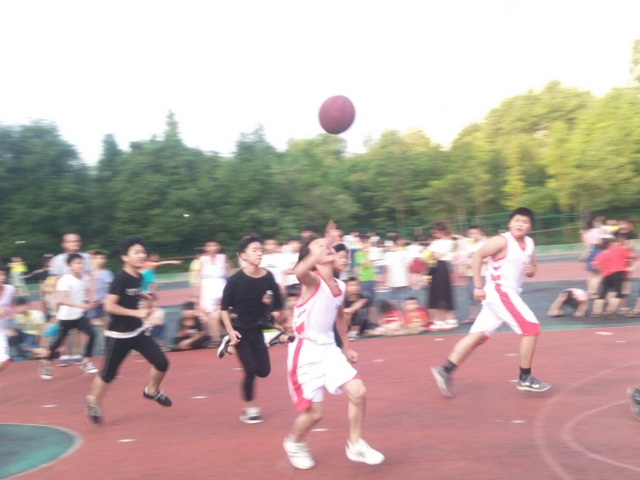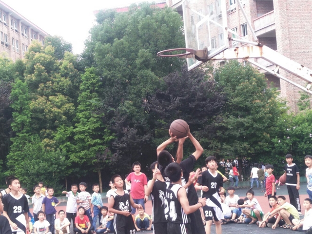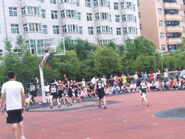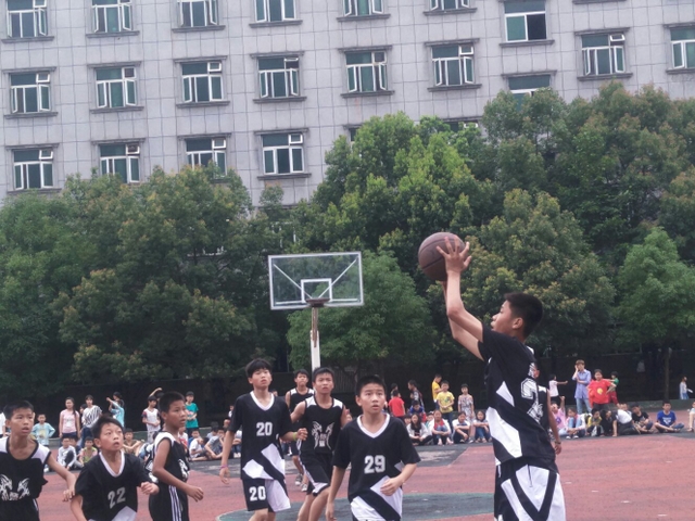 13日上午第四节11∶10,最激动人心的时刻——冠军争霸来临了。着黑色无袖球衣的是275班的健将,着黑色短袖球衣的是276班的健将。六年级全体师生将球场四周围得水泄不通。场上两军对峙,犹如上山虎遇下山虎,你追我堵,左冲右突,险象环生,真可谓棋逢对手,将遇良才。上半场276班所向披靡,连中“三元”,队员情绪格外高昂。场外观众心都提到了嗓子眼,心随物动,情随心生,一会儿喝彩!一会儿叹惜!一会儿怒吼!一会儿骄傲!275班拼死鏖战,终于投进一球,实现“0”的突破,2∶12结束上半场比赛。