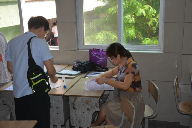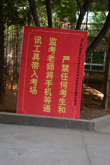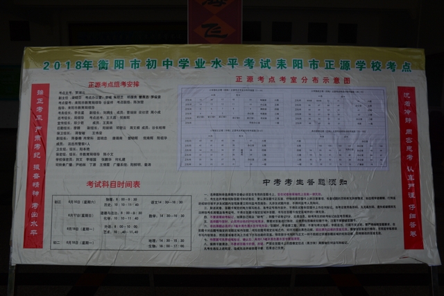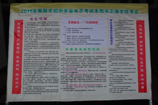 所谓初中学业水平考试,也就是初中毕业考试,包括初二年级的生物、地理考试,以及初三年级的其他各学科考试两个部分。本次考试,正源考点共有2854名初三学生参考,其中正源1689人,慈晖962人,五中138人,三架65人,设95个考室;初二学生3130人参考,其中正源1789人,慈晖1121人,五中162人,三架58人,设105个考室。15日下午,耒阳一中、二中、实验中学的监考老师陆陆续续来到正源学校参加考务工作会议,布置考室。进入南校门,就能看见两块写真欢迎标语暖人心房,大厅正中上方高悬着“衡阳市2018初中学业水平考试耒阳正源考点”横幅特别抢眼。在通往报告厅的各路口竖着指示牌,老师们按图索骥,迅速到达开会地点。在小学部区域,放着“考点须知”宣传牌,教学楼过道上用水清洗得干干净净,考室内桌椅摆放得整整齐齐,黑板上“沉着冷静仔细守纪”等八个大字工工整整。