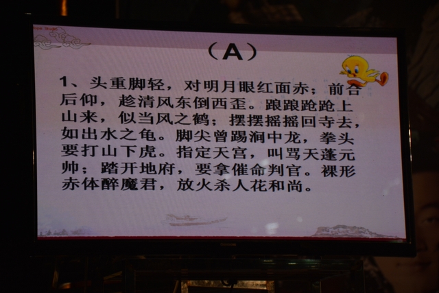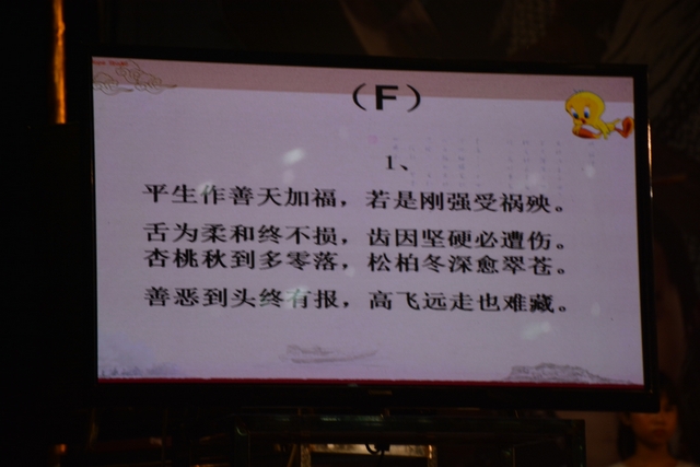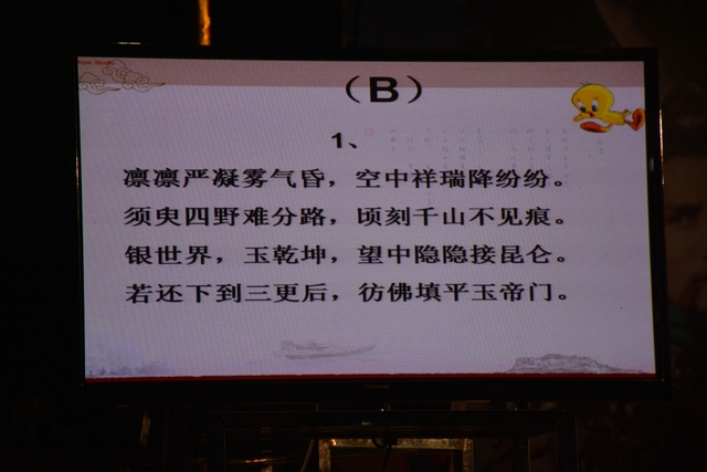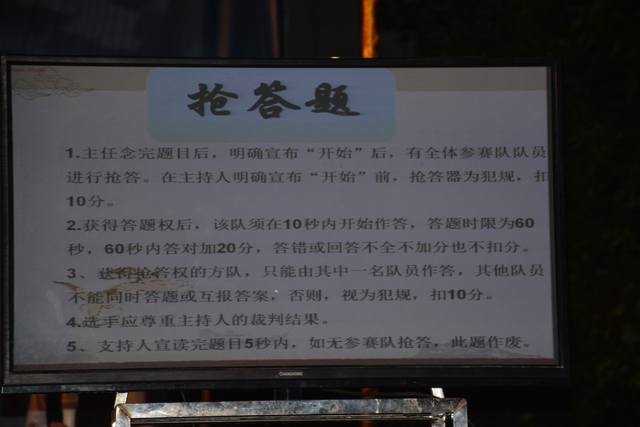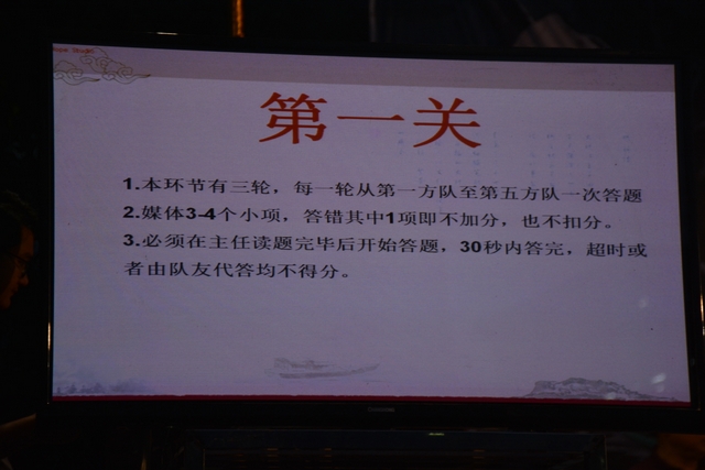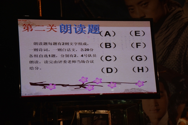 第二环节是“美文诵读”——朗读题。各队分别由2、4号选手朗读一则诗词和白话文,各20分,错一字,或者错一处断句扣1分,扣完此项应得分10分为止,另外声音洪亮、吐字清晰5分,朗读流畅、富有表情5分。此环节各队失分都不多。