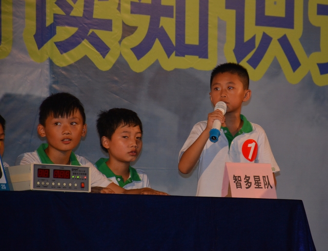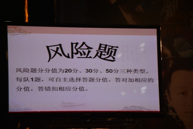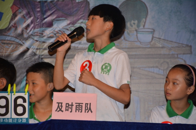 第四环节“舍我其谁”——风险题,这是一个决定胜负的环节。分20分、30分、50分三个分值档次,任选一个档次中的一题,答对得相应分,答错扣相应分。及时雨队稳打稳扎,巩固战果,选了一个30分题,这是比较保守的选择。结果答错,扣除30分,还剩286分,即使暂列第二名的队选择50分值的题回答正确,也动摇不了及时雨队冠军的地位。紧接着玉麒麟队也只选了一个30分题,而且答错,比分降至167分,失去了进军前三甲的机会。智多星队同样选了一道30分题,也忙中失误,扣除30分,剩下184分。入云龙队见前面三支队都选30分题失利,改选一个20分题,回答正确,比分上升至243分,稳居第二名。最后轮到黑旋风队,如果也像前几个队一样选择低分档,他们就只能还是垫底,可是李佳乐同学突然选了一道50分题,真是石破天惊,同学们既佩服他的勇气与担当,又为他捏一把汗。题目出来,李佳乐同学从容镇定,一字一句铿锵有力,似乎成竹在胸,志在必得,结果不负众望,回答正确,一举把总分提升到191分,成功跻身前三名,夺得季军!台下响起长时间的热烈掌声。