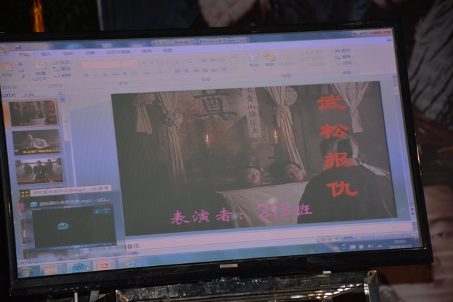 七点半钟,在周子娟老师指导、二十名古装少女对《礼》进行一番轻姿曼舞的演绎之后,五支参赛队闪亮登场,他们分别是:215班独立组成的及时雨代表队,216班独立组成的玉麒麟代表队,217、218、220、221班联合组成的智多星代表队,213、214、224、225班联合组成的入云龙代表队,219、222、223班联合组成的黑旋风代表队,每队五名选手。他们各自以《水浒传》中描述相应好汉的诗词名句为口号,宣示本队的特点与雄心壮志,别出心裁,夺人先声。