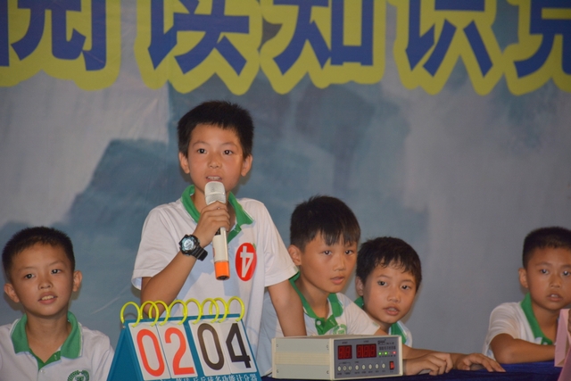 小学部学部主任罗俊豪讲话。他一连用四个“好”总结了这场比赛。一是场上25位选手表现非常好。他们没有赛前背诵答案的痕迹,团结合作,配合默契,正确率高。二是题目设置非常好。有梯度,有难度,阅读量大,学生受益多。三是为台下观众道一声好。尤其是“开火车”互动环节,电脑随机抽签,每一轮都能开出五六个人远,说明大多数同学都普遍掌握得比较好。四是年级组织非常好。无论是比赛环节,还是表演互动环节,还是其他年级晚自习课间时间围观环节,都井然有序,充分说明四年级是一个同心同德、团结协作、特别能战斗的坚强团体。