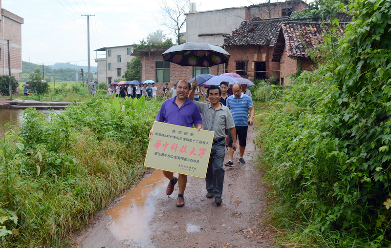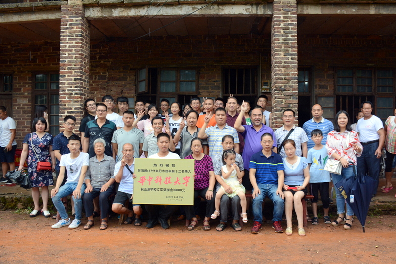 罗校长一行刚进村口,迎宾人员即刻点燃了喜炮,以传统的方式迎接正源师生的到来。罗校长亲自为吴海峰 授予奖牌,毛书记为吴海峰母亲颁发了一万元文军奖学金,热烈祝贺吴海峰同学以647分优异成绩考取了华中科技 大学。