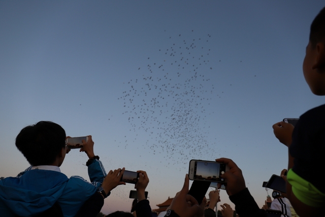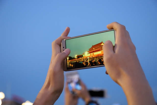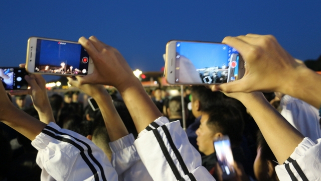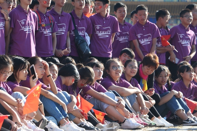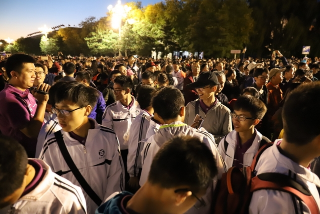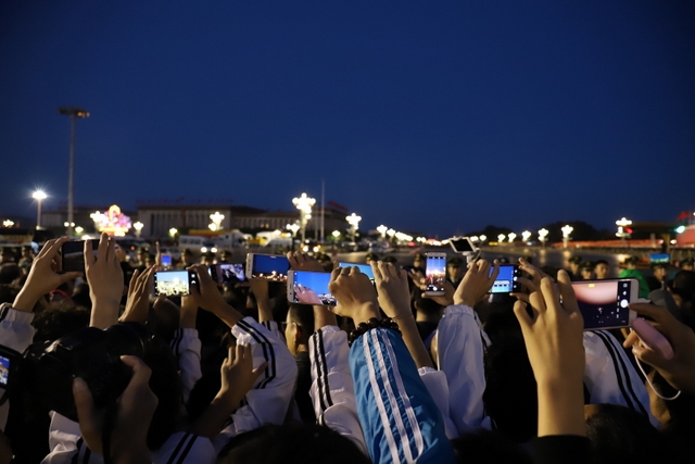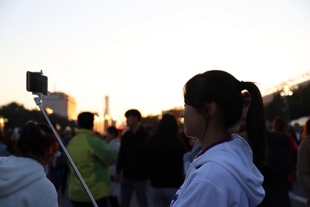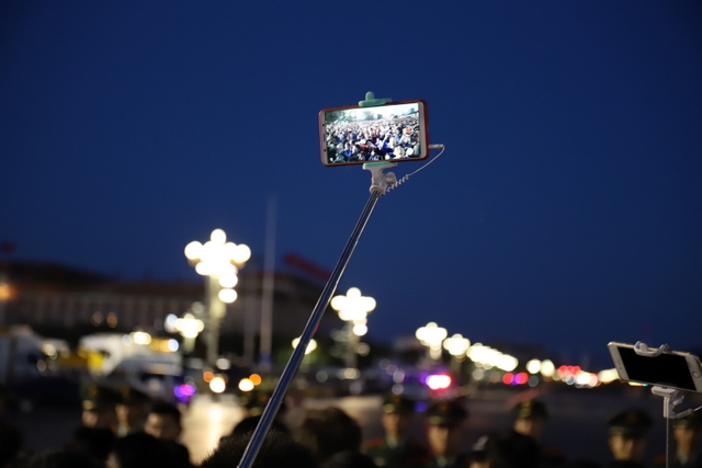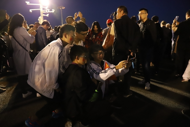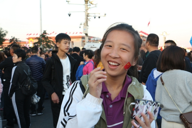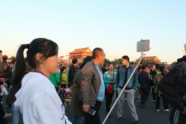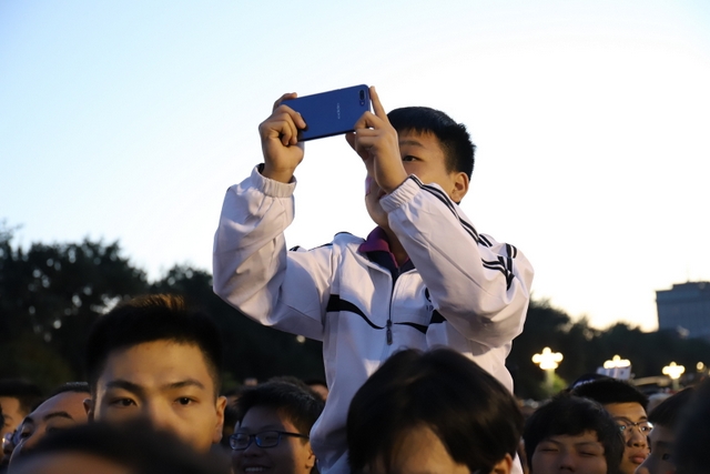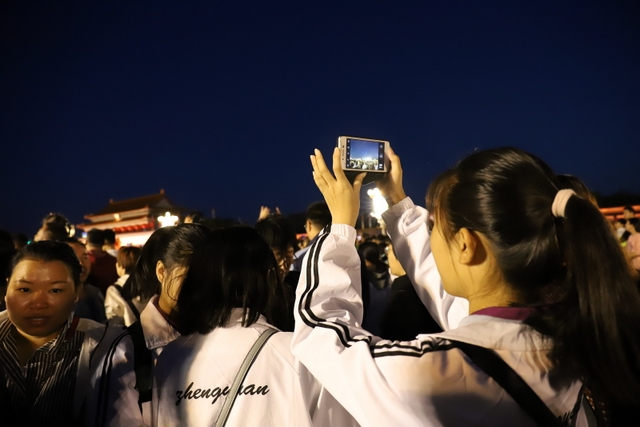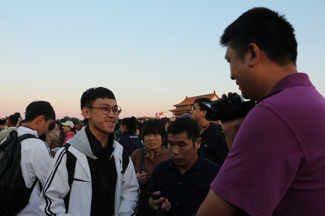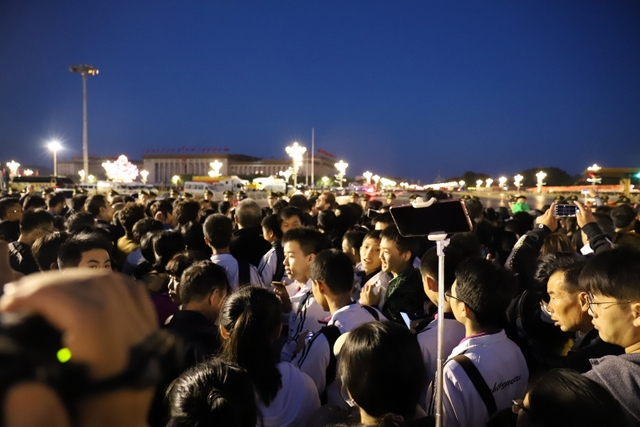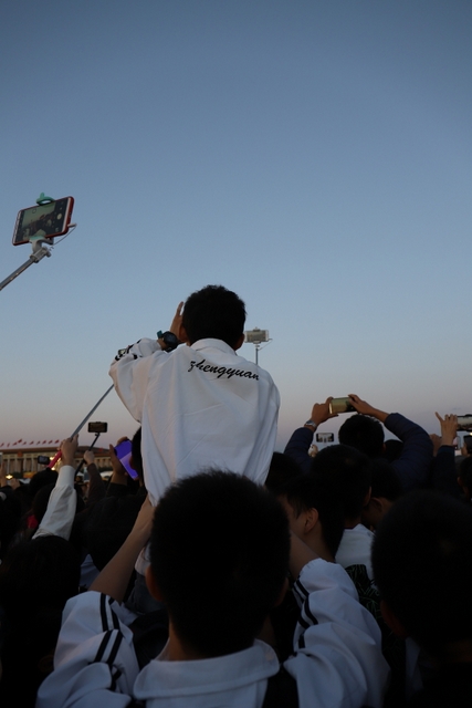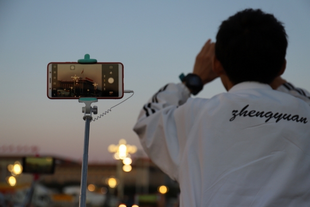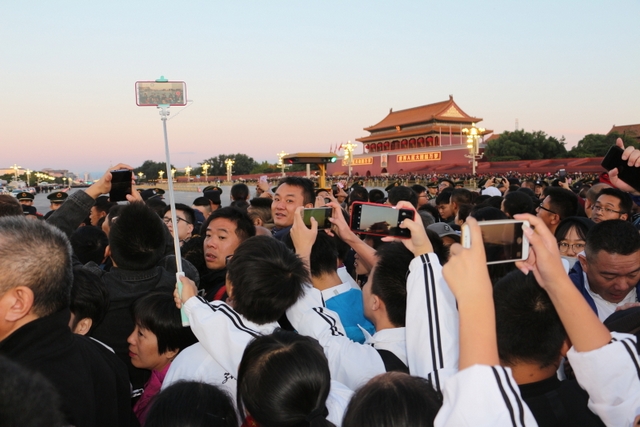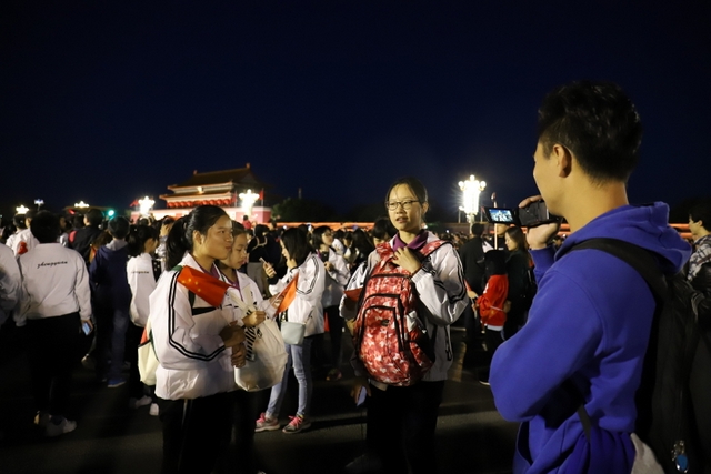 凌晨5时多,师生们来到天安门广场。广场花团锦簇,人流如织,同学们纷纷掏出手机争相拍照。169班廖明同学为了抓拍到满意的镜头,特别买了自拍杆。6时多,国旗队的战士迈着整齐的步伐走出城门,在雄壮的国歌声中,五星红旗高高升起……人们一个个举起手机抓拍这个难忘的瞬间。