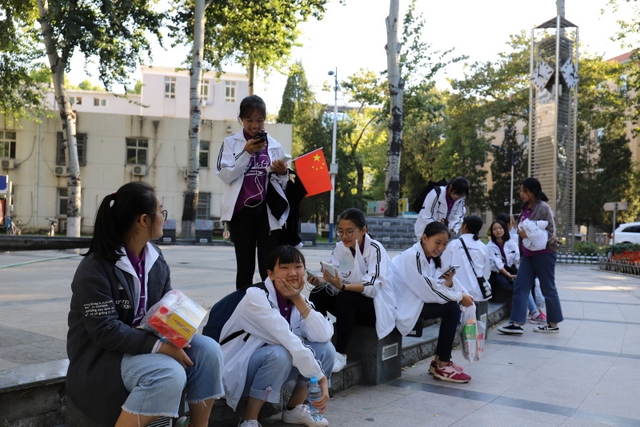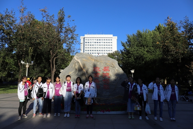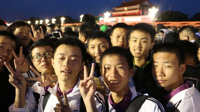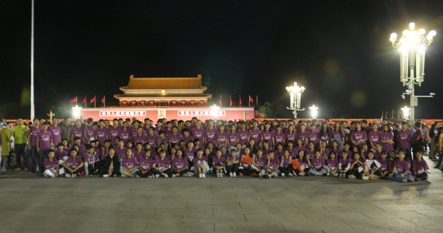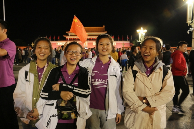 天安门广场中间,一个大型花篮聚集了全国各地游客的目光,天安门城楼灯光相互辉映,显得大气磅礴。同学们在广场上或是自拍,或是到处游览,好不欢快。在带队老师的组织下,励志团队列队在广场中央拍了一张全家福。