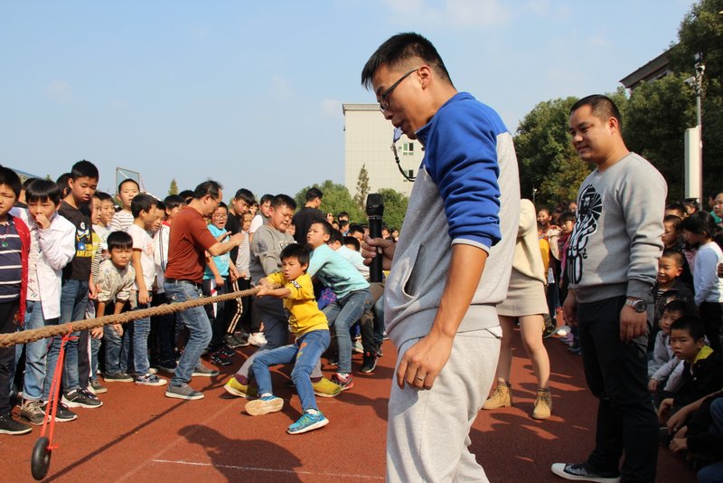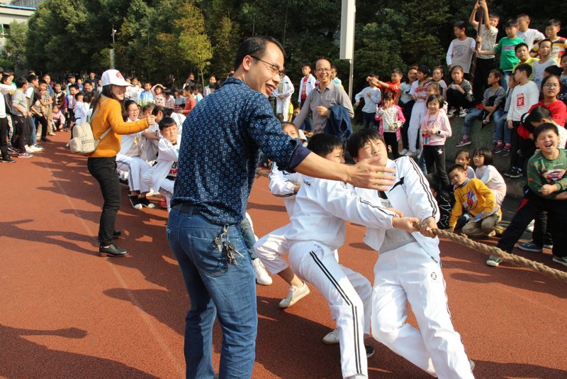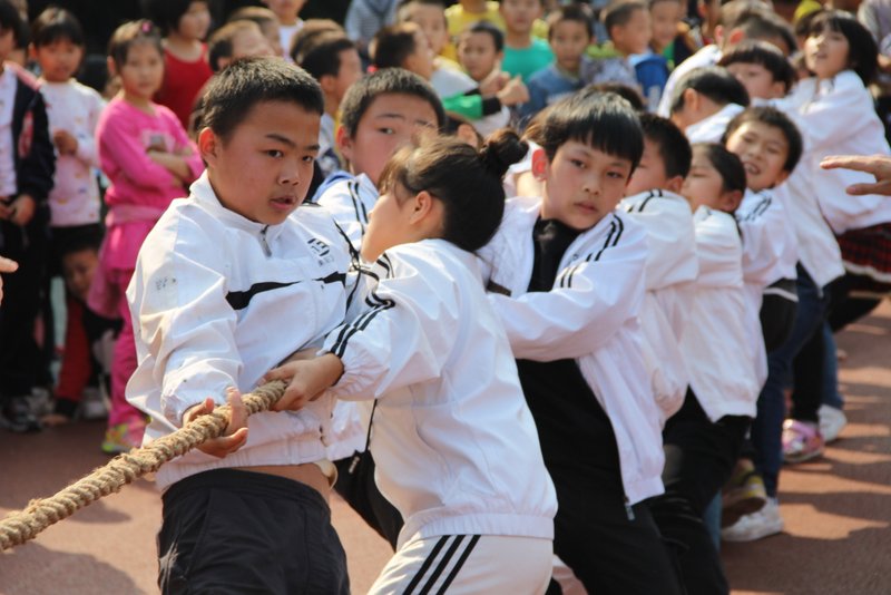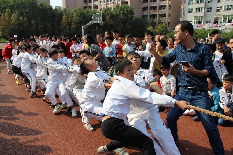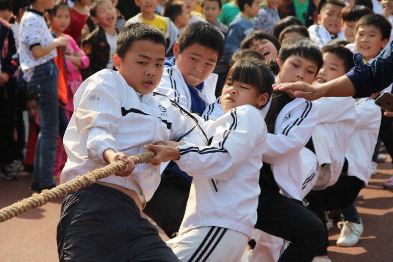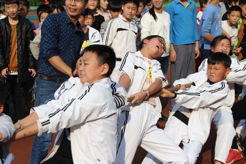比赛场中各班运动员紧握麻绳,使出全身力气,仰头咬牙,使劲往后拉,20名健将的力气聚合在一起形成一股强大的拉力,在同学们的加油声中互相较量比拼,这是力量和意志的比拼。经过2个多小时的激烈角逐,最终六2班和六4班脱颖而出,进入决赛。决赛中,双方势均力敌,红色标记在两队之间左右移动,双方各胜一局,难分胜负,把比赛推向高潮。决定冠军的第三局比赛开始了,在同学们激扬的加油声中,双方运动员互不相让,大家的脸涨得通红,拼命把身子压低,双手往后拉,绳子僵持在中间,仿佛快要断了一般,最终六4班力压群雄获得冠军。