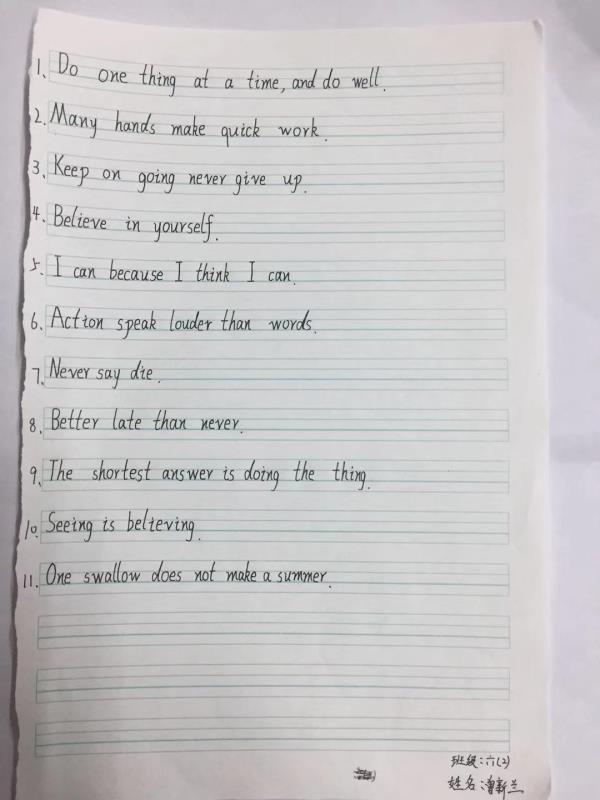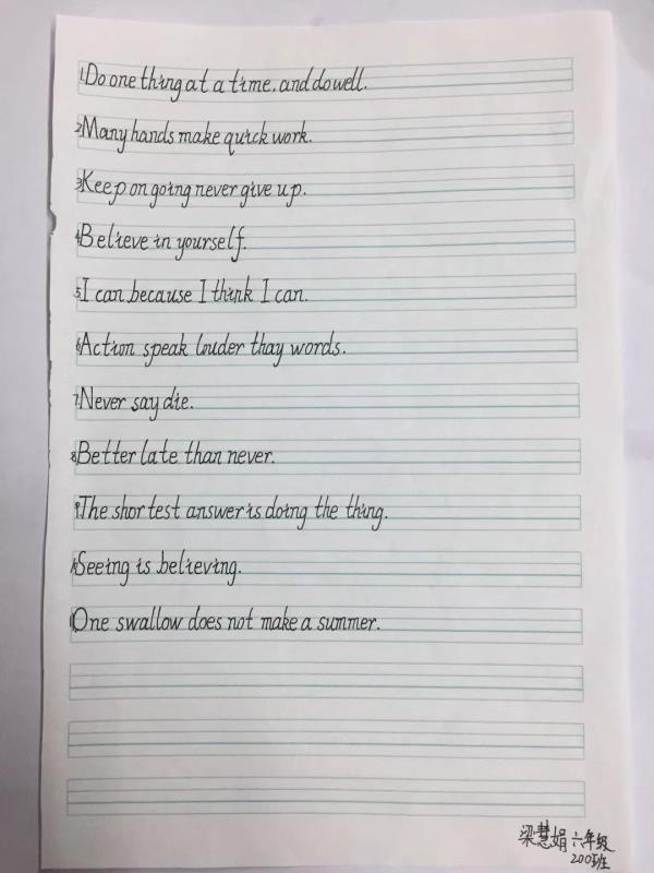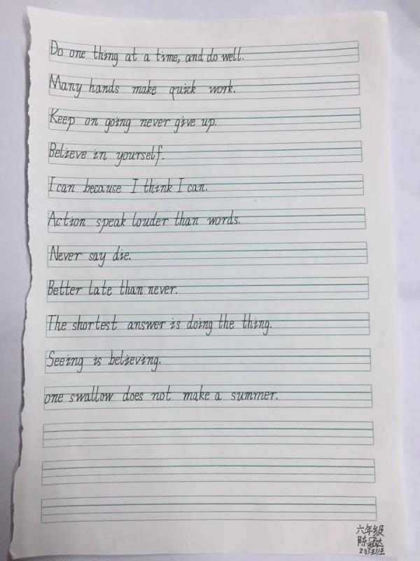 为进一步规范学生英语书写,培养良好的书写习惯,我校六年级英语组在12月7日、11日分别在班级开展了英语书法比赛,970名学生积极参与其中。