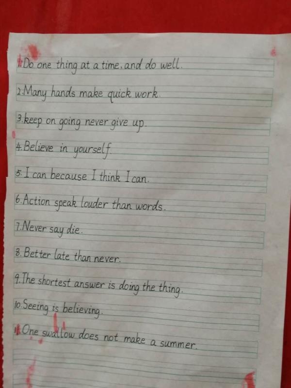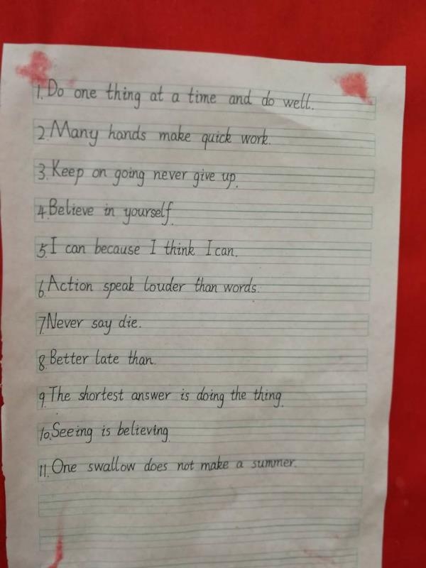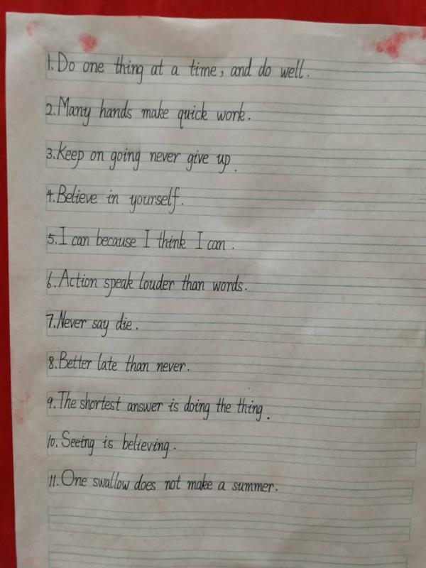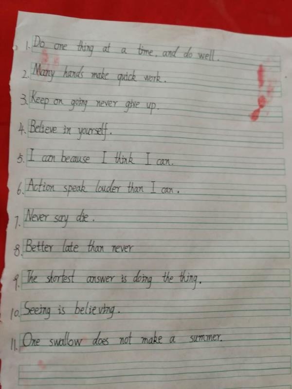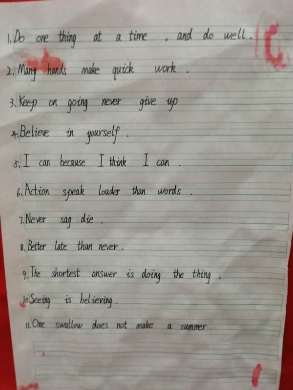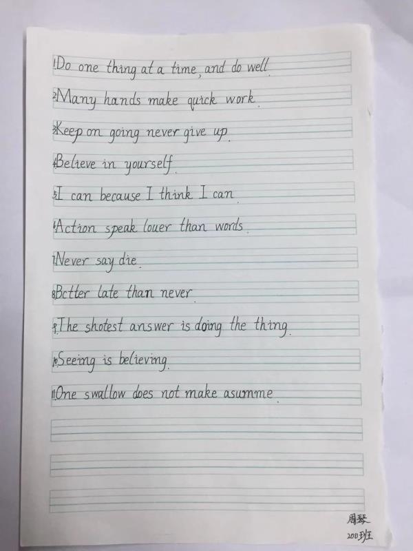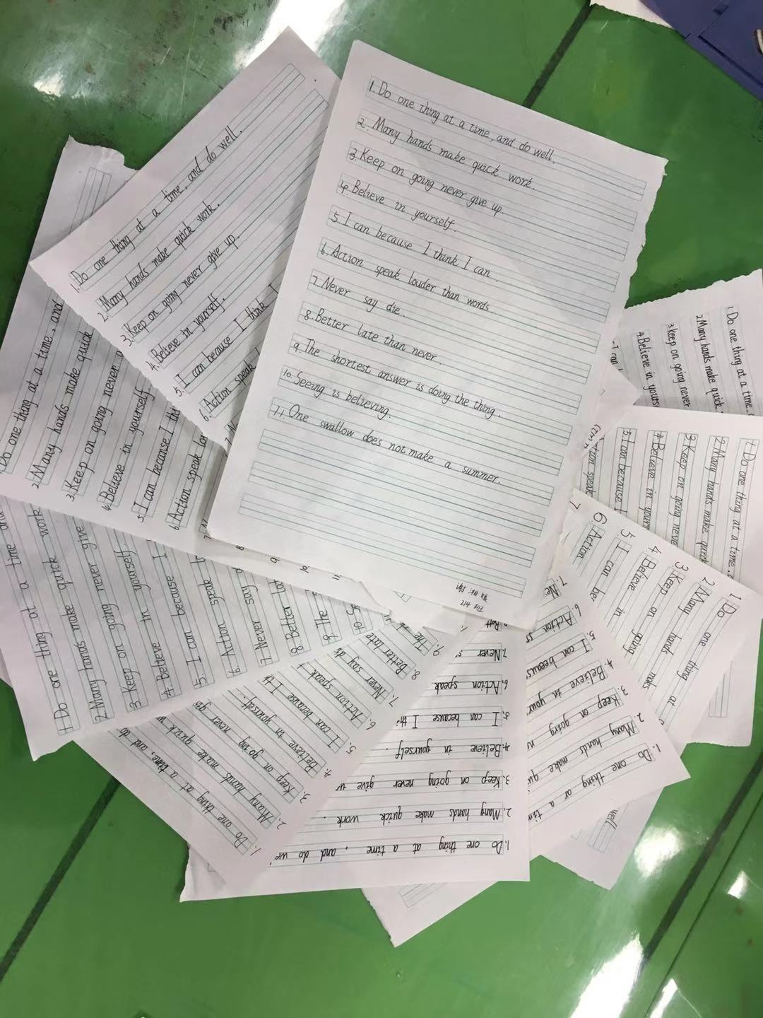 各班任课老师在教学过程中,非常重视规范美观的英文书写,并向同学们强调了英语书法规范的重要性。字如其人,比赛过程中,学生们一丝不苟、认真书写,尽其所能地展示各自的才能。手写印刷体竞相争艳,英文字母在同学们的笔下摇曳生姿。英文书写彰显出不一样的美。