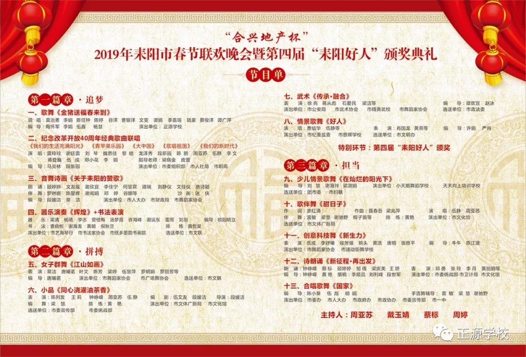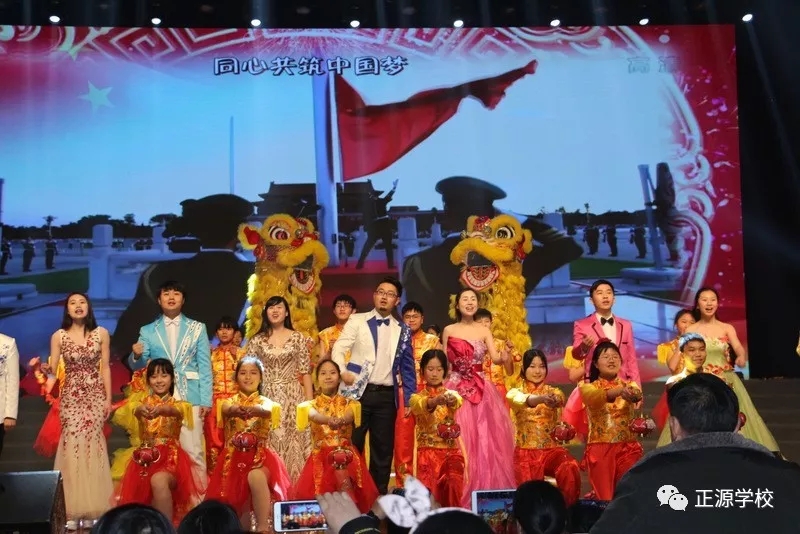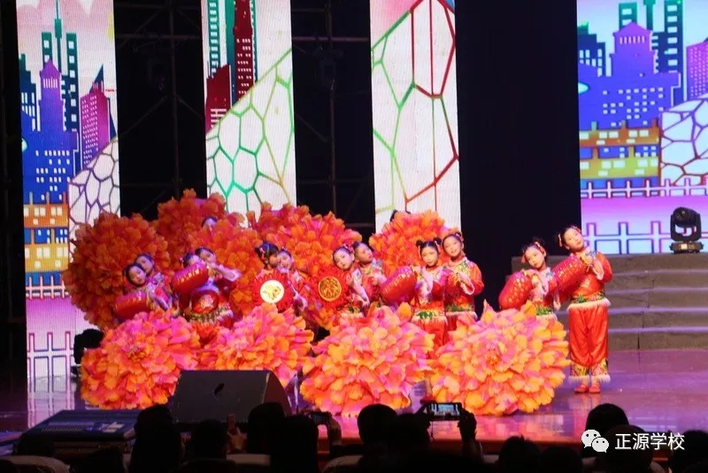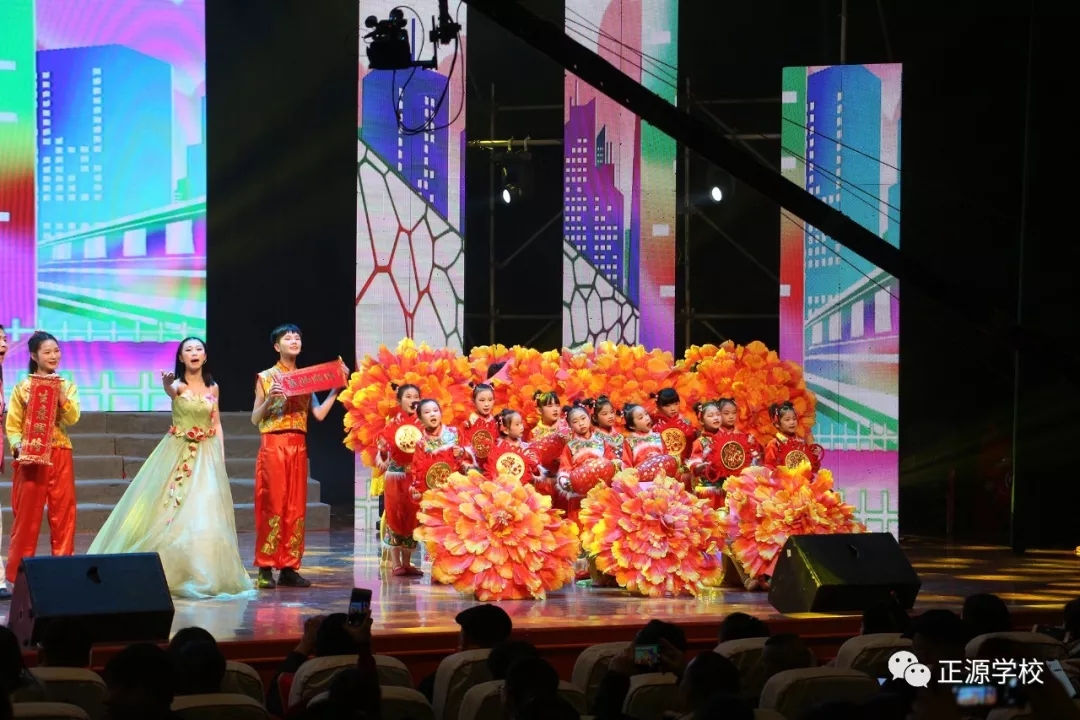 正源学校的开场舞以耒阳人民满怀豪情迎新春为主调,凸显全民大联欢、普天同喜庆,抒发耒阳人民同心同梦、携手共进的昂扬斗志。豪华的阵容,绚丽的舞美,烘托出节日的喜庆气氛;秧歌、舞狮等传统民俗元素,为晚会带来更深层次的文化内涵;122位师生演员载歌载舞、欢天喜地。演员们来自正源学校小学、初中、高中三个学部的班级以及音乐老师、语艺老师,其中最小的演员年仅4岁。