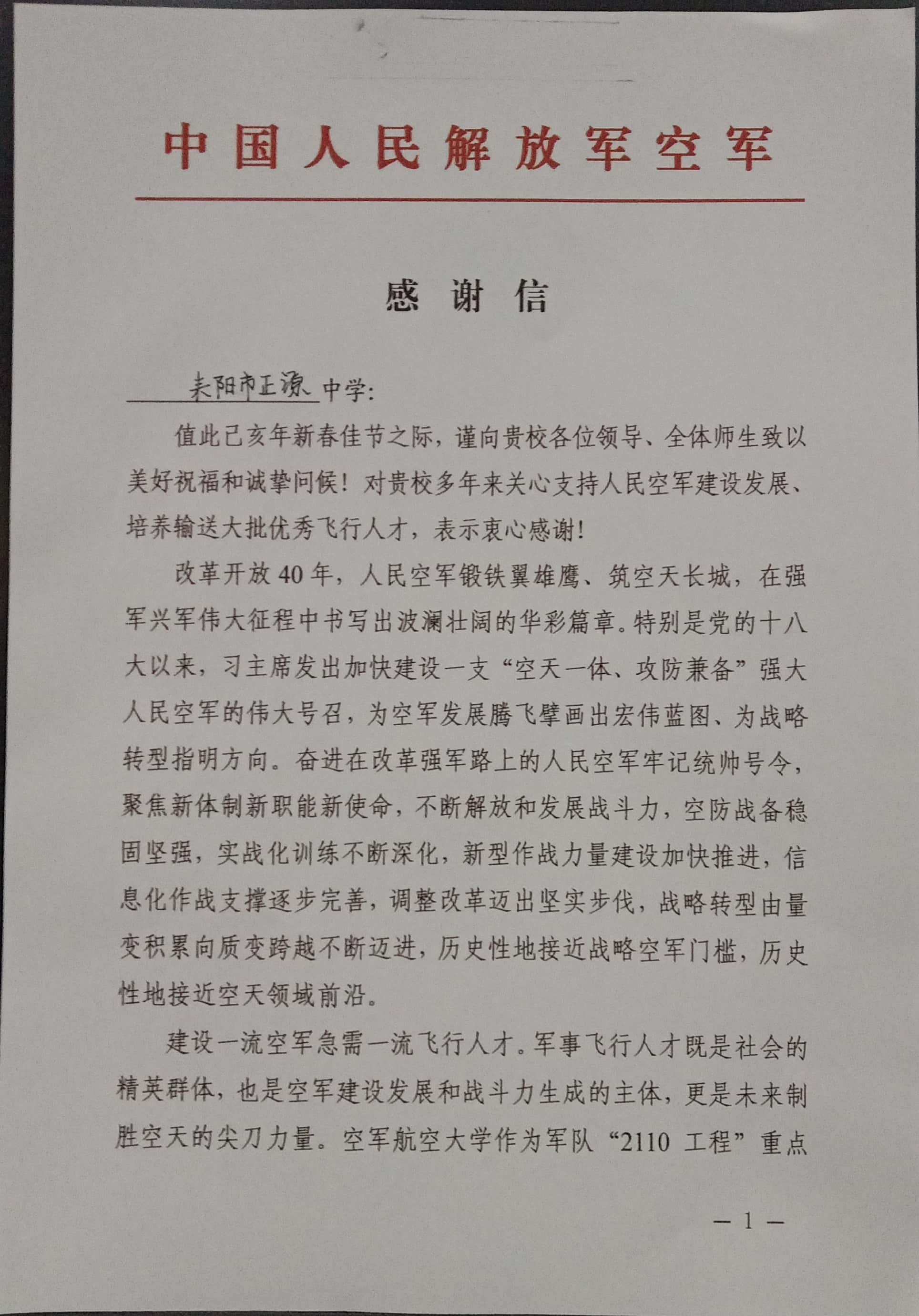 随着一大批正源学子考取全国各名牌大学,每年来自各大学的喜报和感谢信可以说是不计其数。今天,来自中国人民解放军空军的感谢信,确实让正源学校的师生骄傲和自豪!