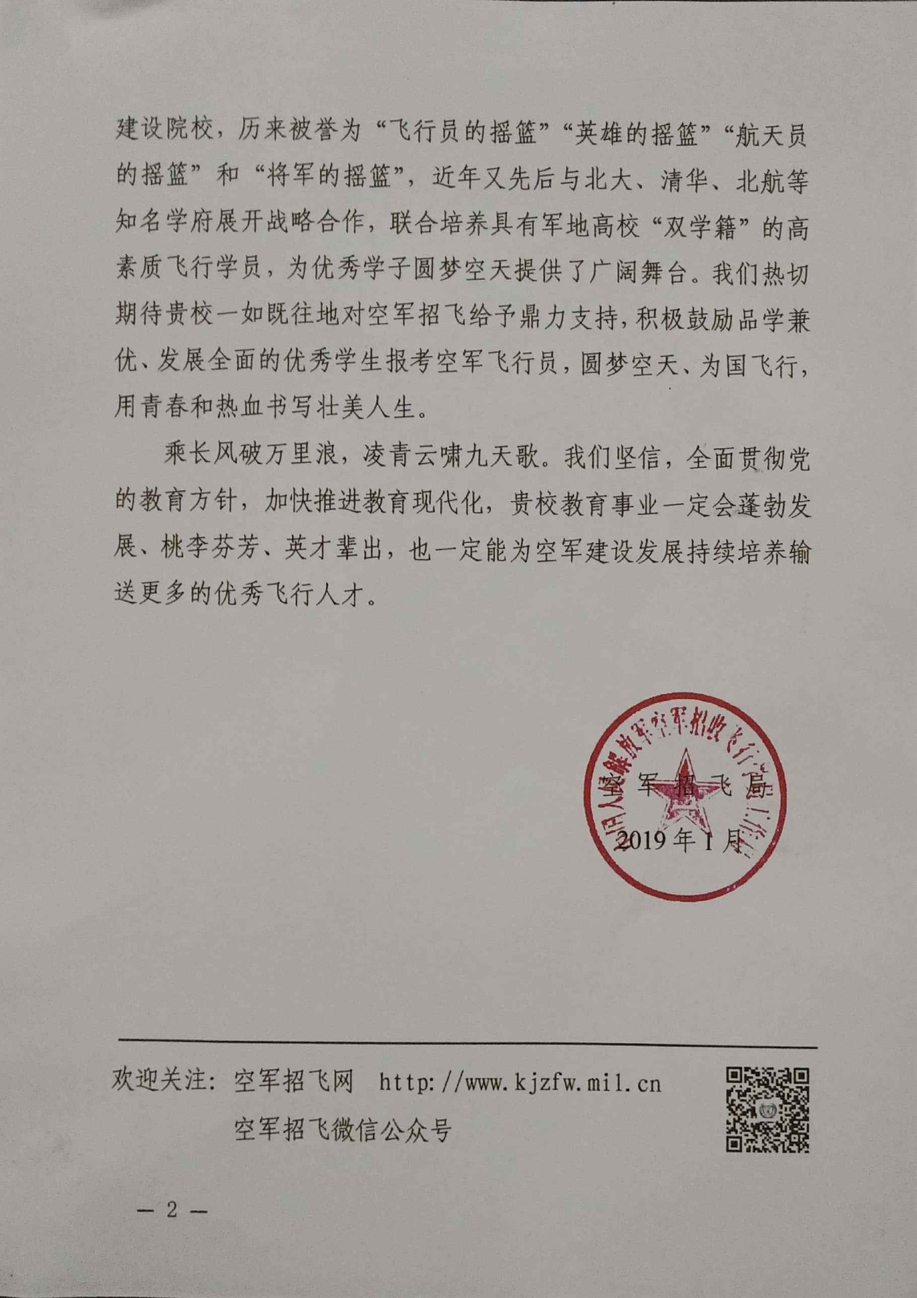 感谢信首先对正源学校致以春节美好的祝福和诚挚的问候,随后介绍了习主席加快建设“空天一体、攻防兼备”空军发展的宏伟蓝图,继而感谢正源学校为空军招飞的鼎力支持,最后祝愿我校蓬勃发展,能为空军建设发展持续培养输送人才。