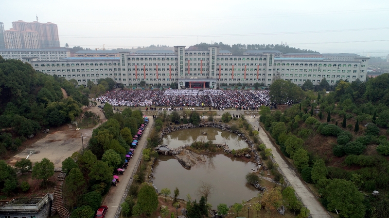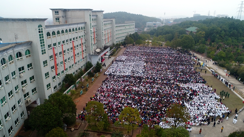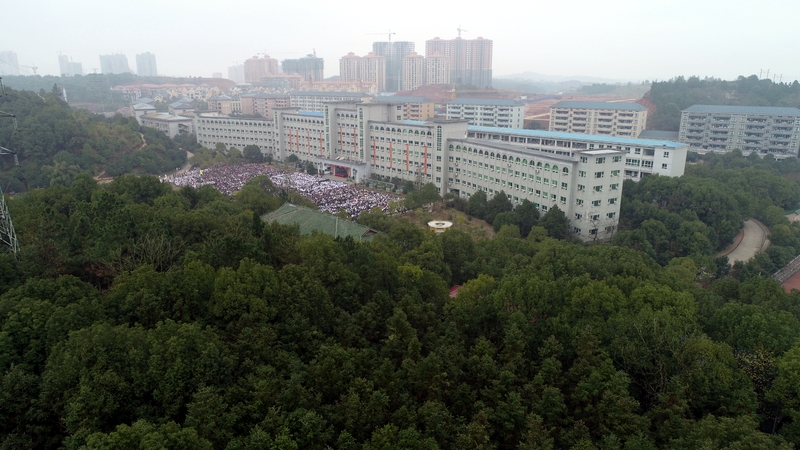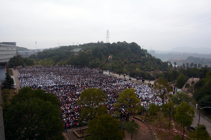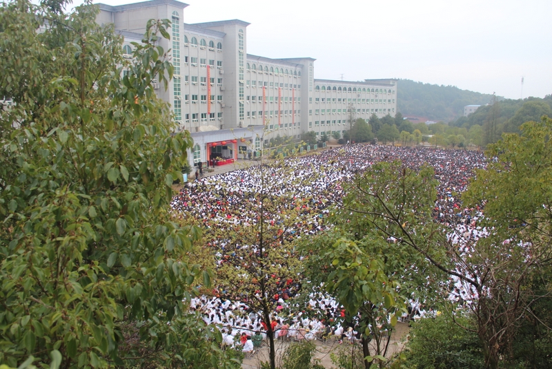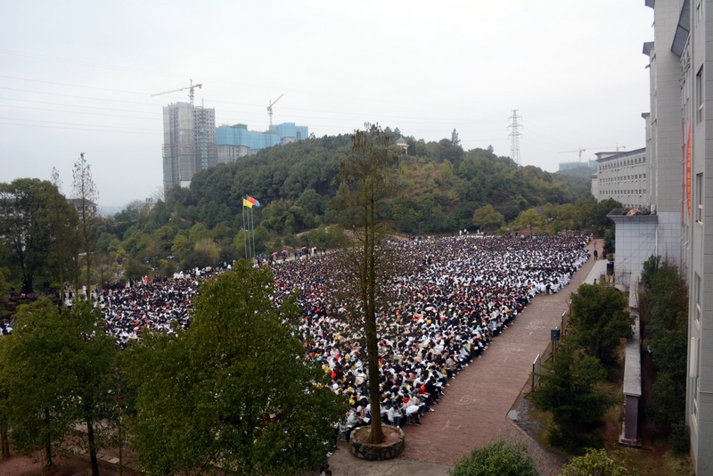 240米长的雄伟主体教学楼如展翅的雄鹰,拥抱着10000平方米的宽阔广场上端坐着的17000名学子。教学楼上垂挂着一条条励志标语,赫然入目,令莘莘学子激情喷发,热血沸腾。